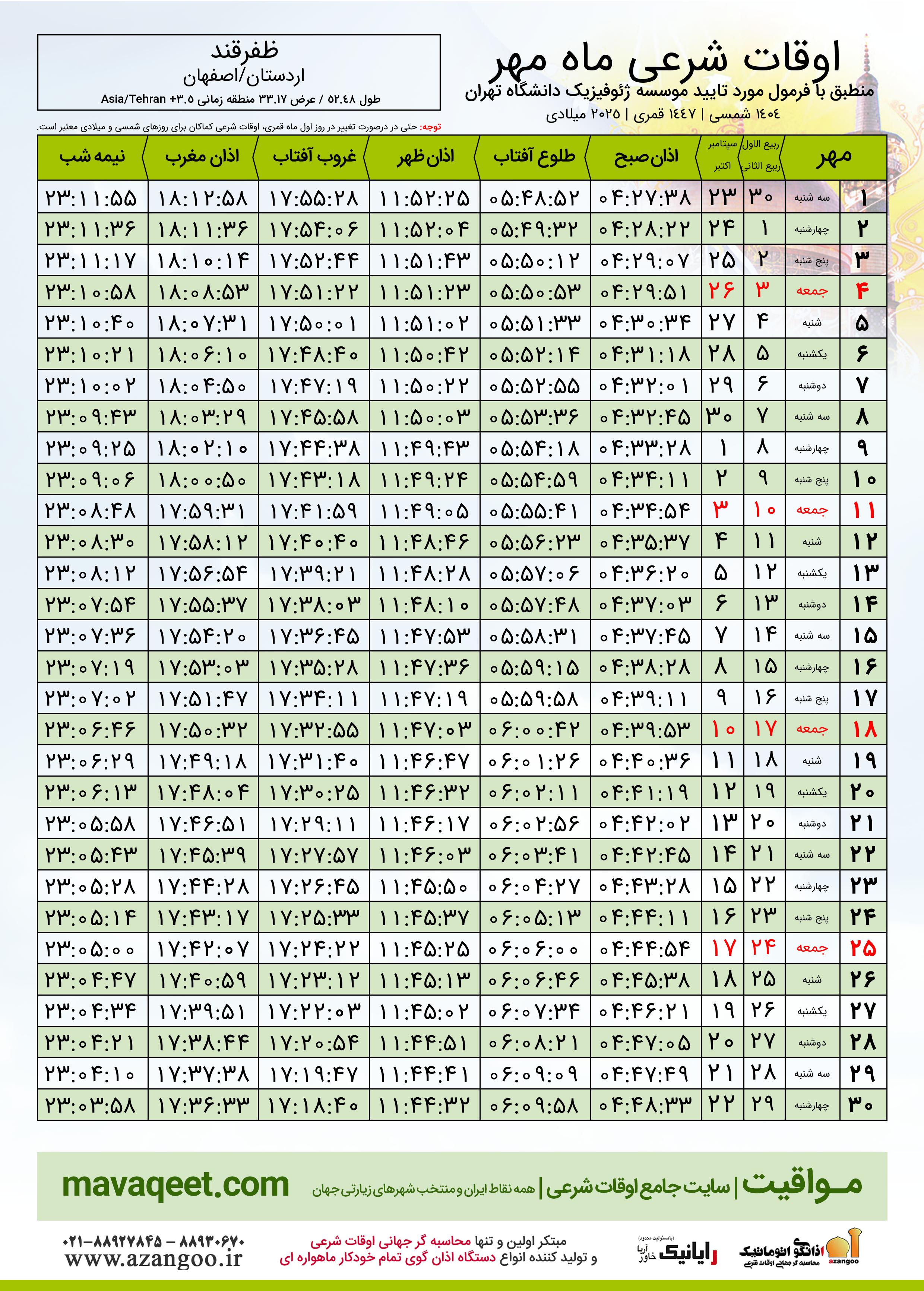 جدول اوقات شرعی مهر ١٤٠٤ شمسی شهر ظفرقند