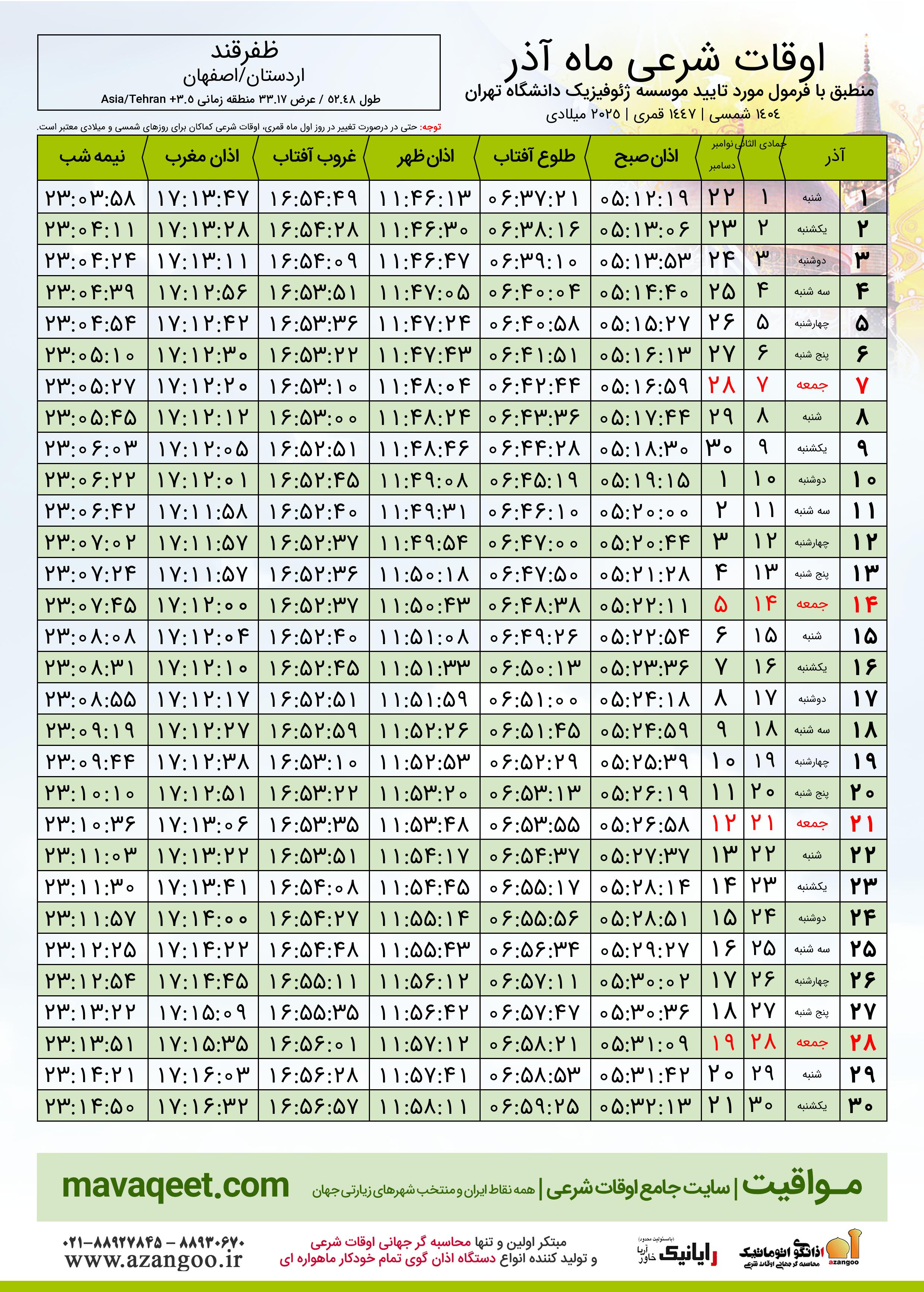 جدول اوقات شرعی آذر ١٤٠٤ شمسی شهر ظفرقند
