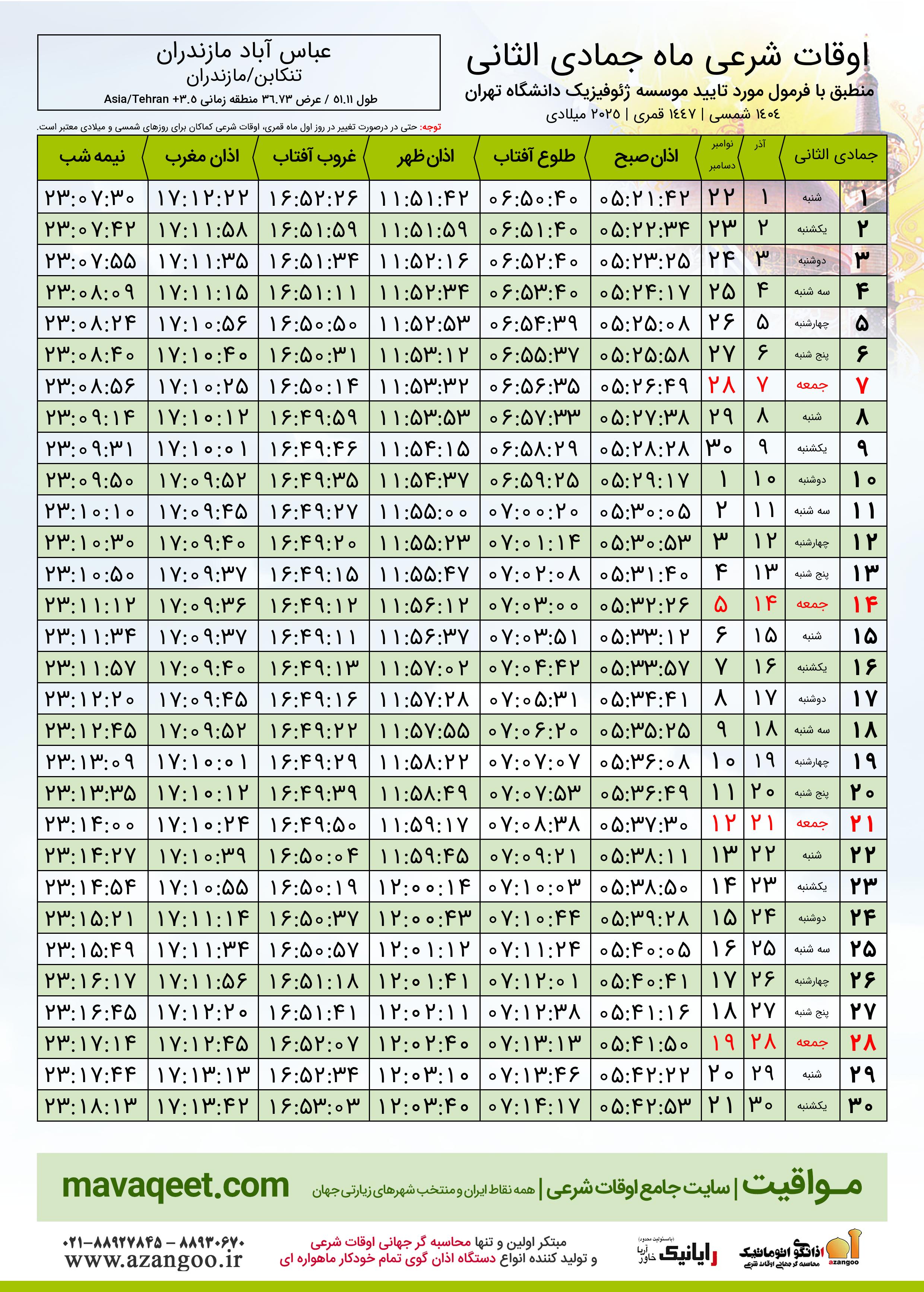 اوقات شرعی ماه جمادی الثانی ١٤٤٧ هـ.ق شهر عباس آباد مازندران بر