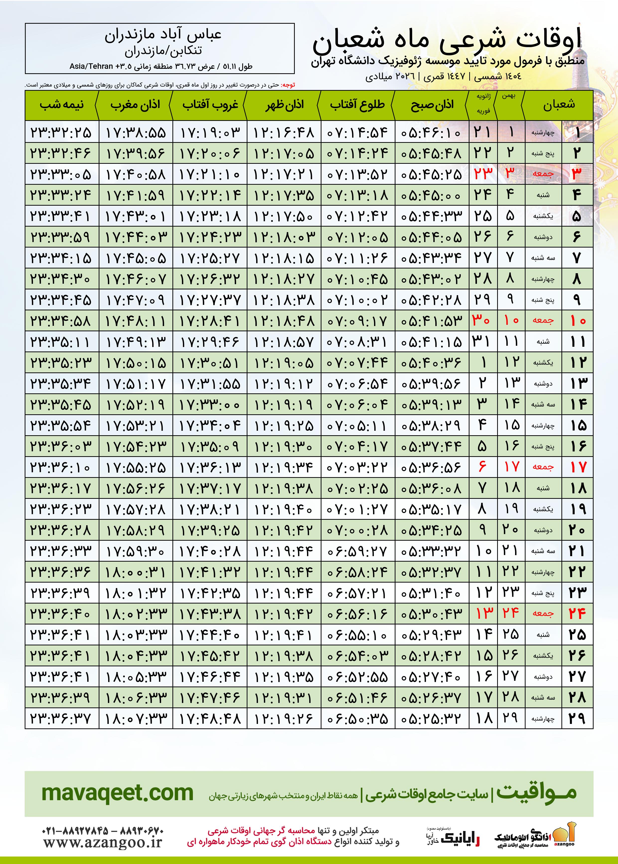اوقات شرعی ماه شعبان ١٤٤٧ هـ.ق شهر عباس آباد مازندران بر