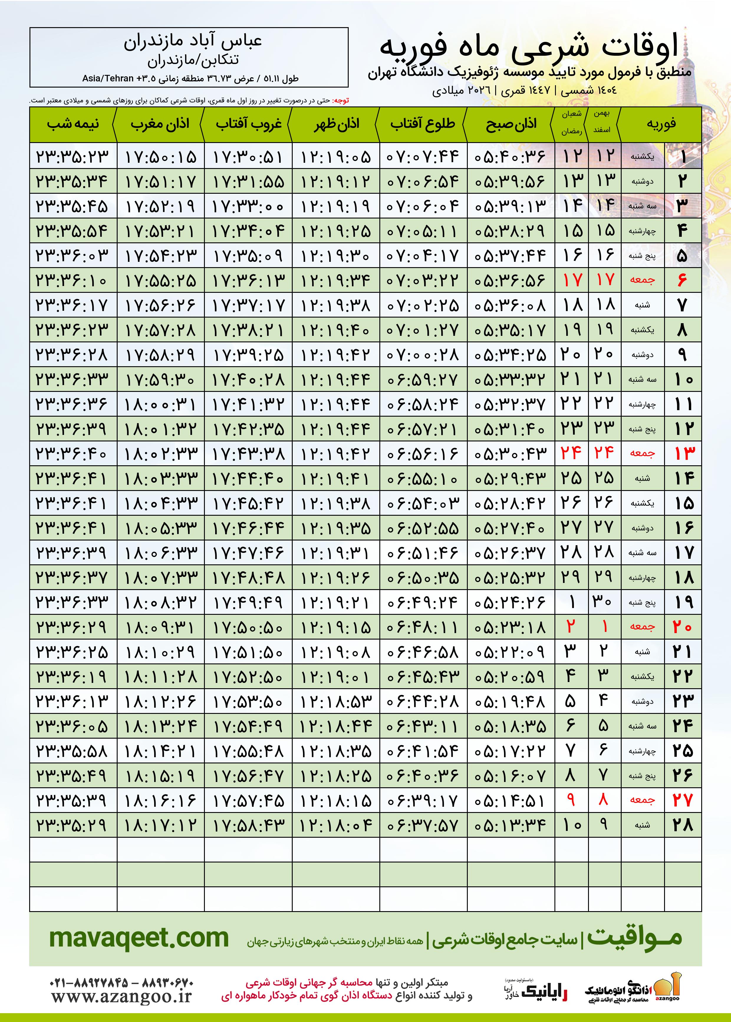 دانلود اوقات شرعی ماه رمضان ٠٤ - ١٤٠٤ شمسی | ٢٠٢٦ میلادی | ١٤٤٧ قمری شهر عباس آباد مازندران