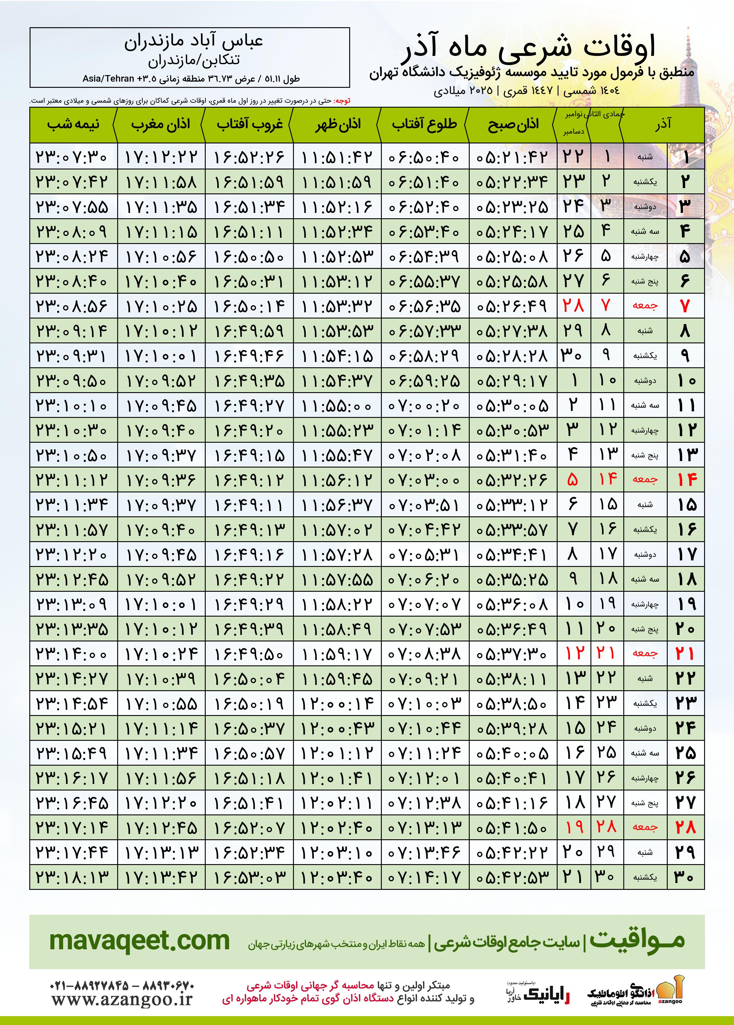 دانلود اوقات شرعی آذر ٠٤ - ١٤٠٤ شهر عباس آباد مازندران