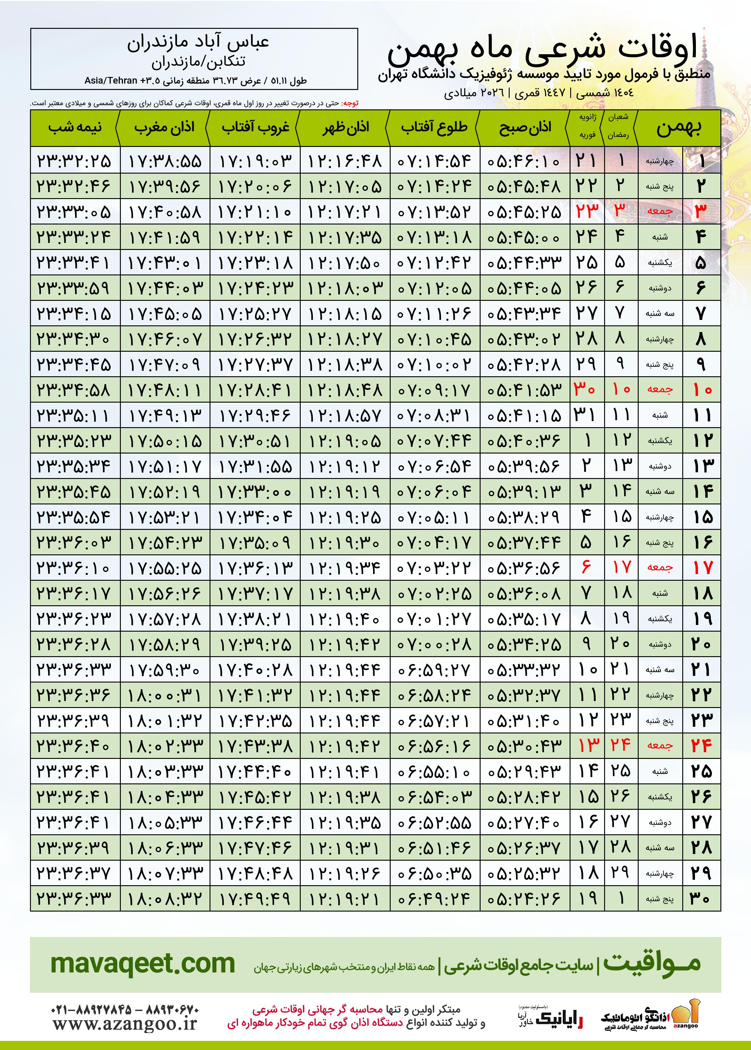 دانلود اوقات شرعی بهمن ٠٤ - ١٤٠٤ شهر عباس آباد مازندران