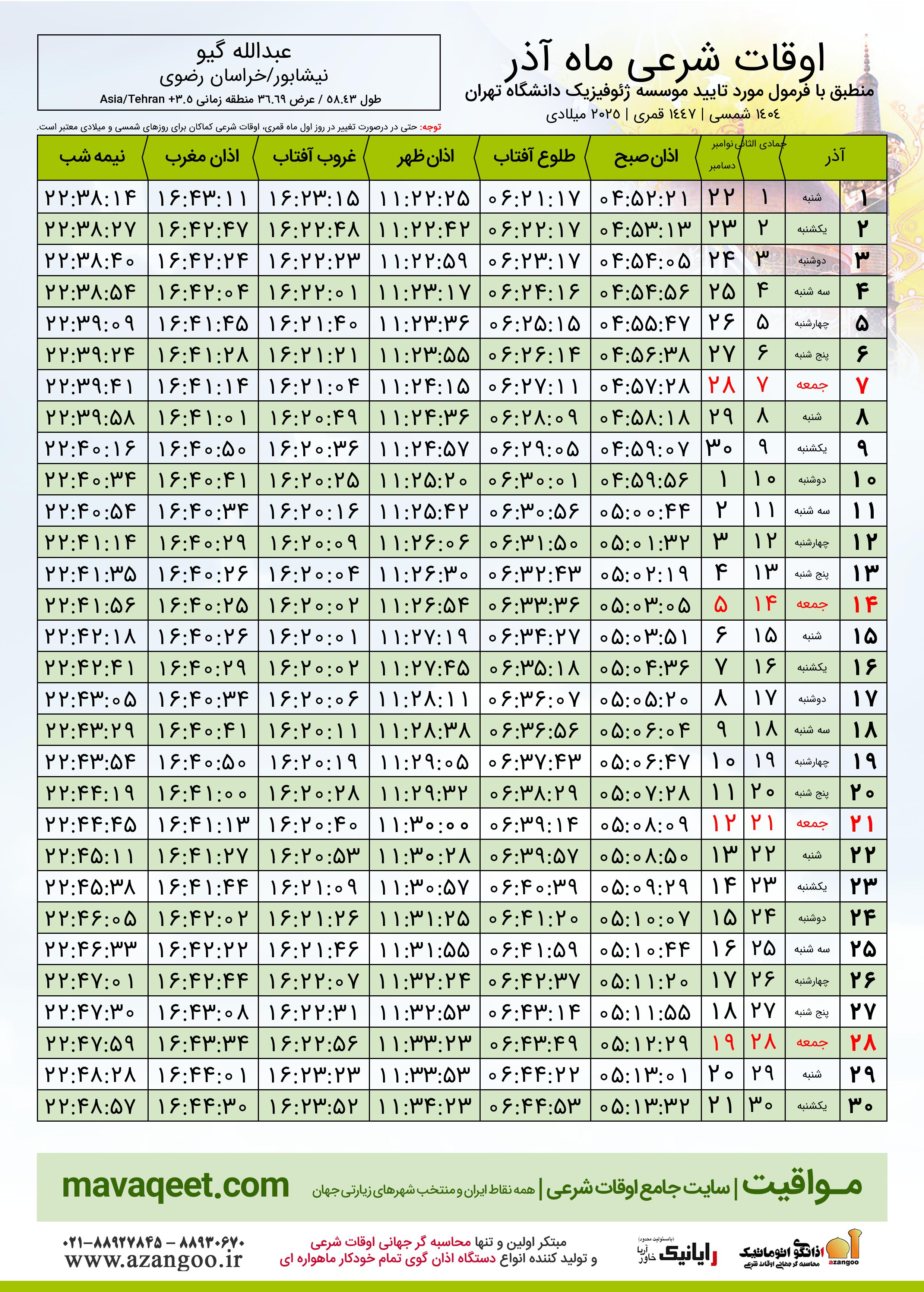 جدول اوقات شرعی آذر ١٤٠٤ شمسی شهر عبدالله گیو