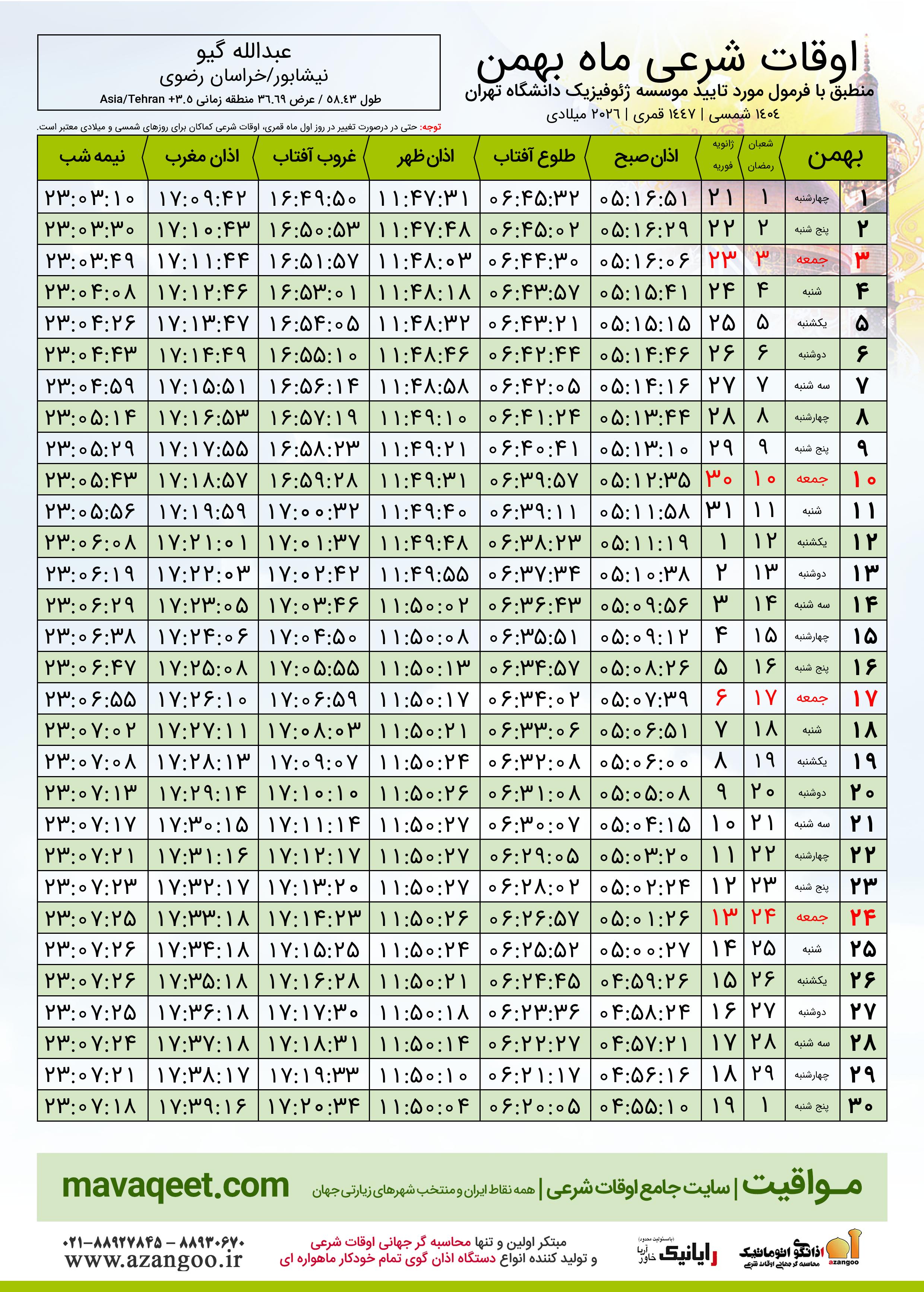 دانلود اوقات شرعی بهمن ٠٤ - ١٤٠٤ شهر عبدالله گیو