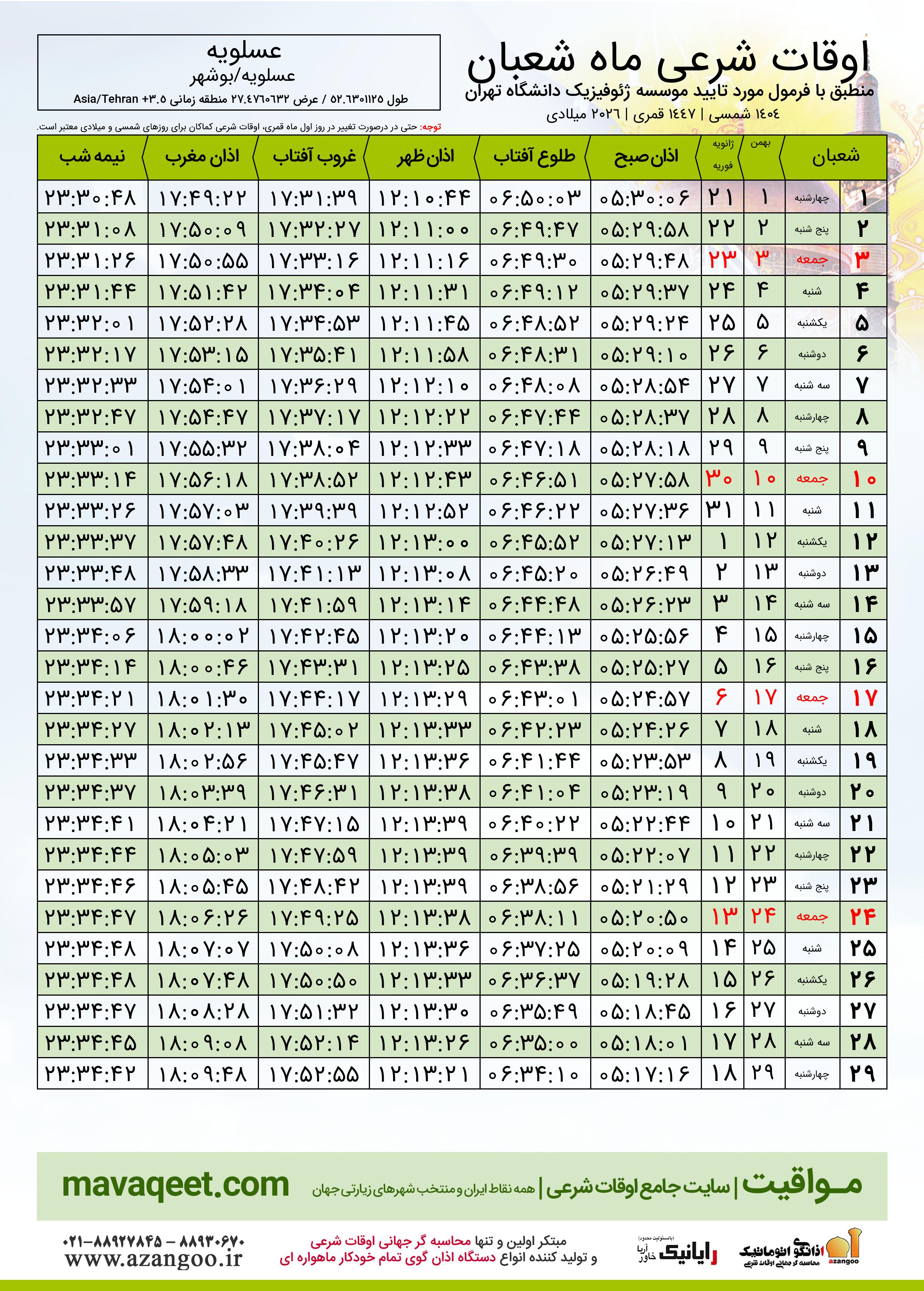 اوقات شرعی شعبان ١٤٤٧ شهر عسلویه + دانلود