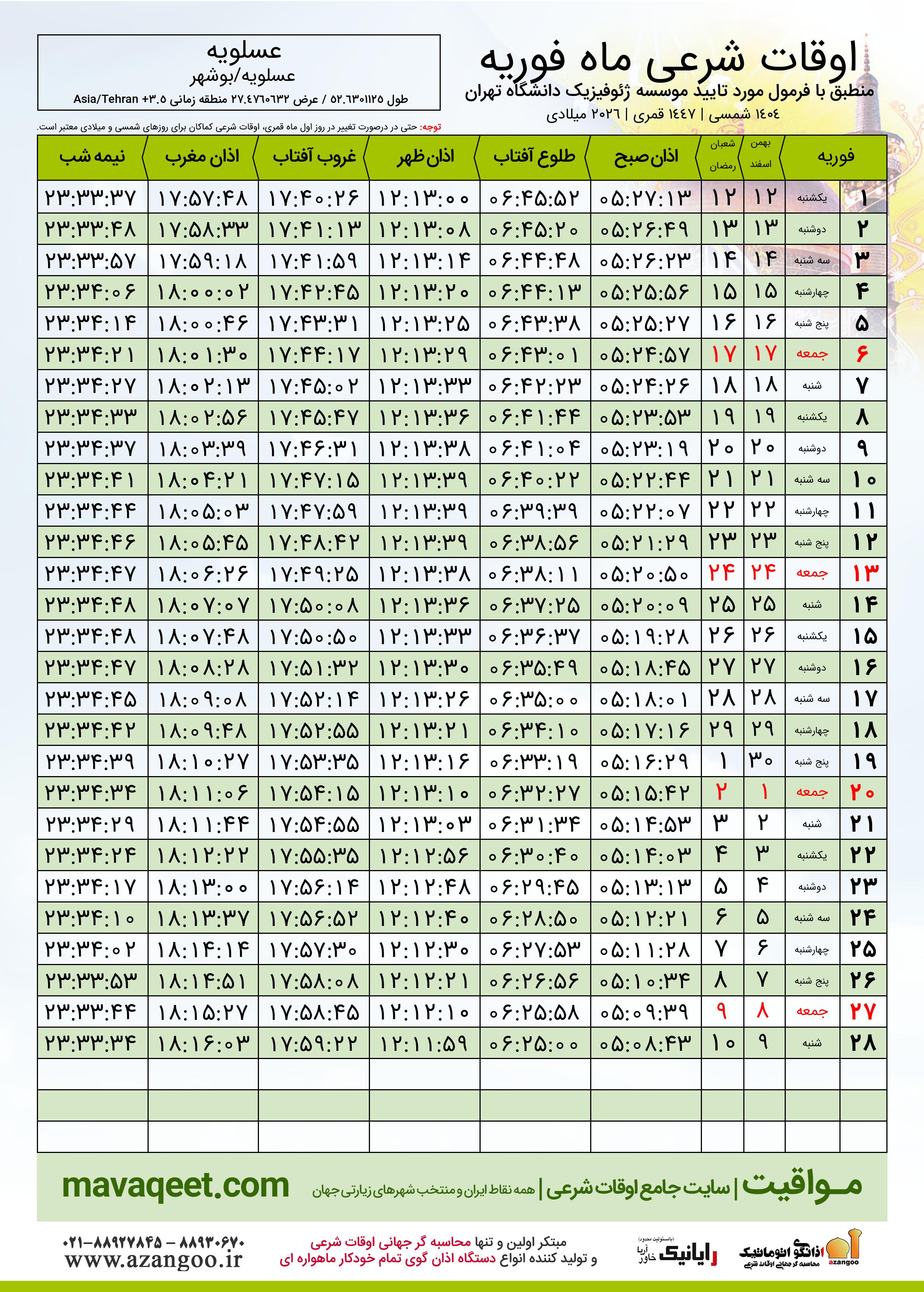 اوقات شرعی فوریه ٢٠٢٦ شهر عسلویه + دانلود