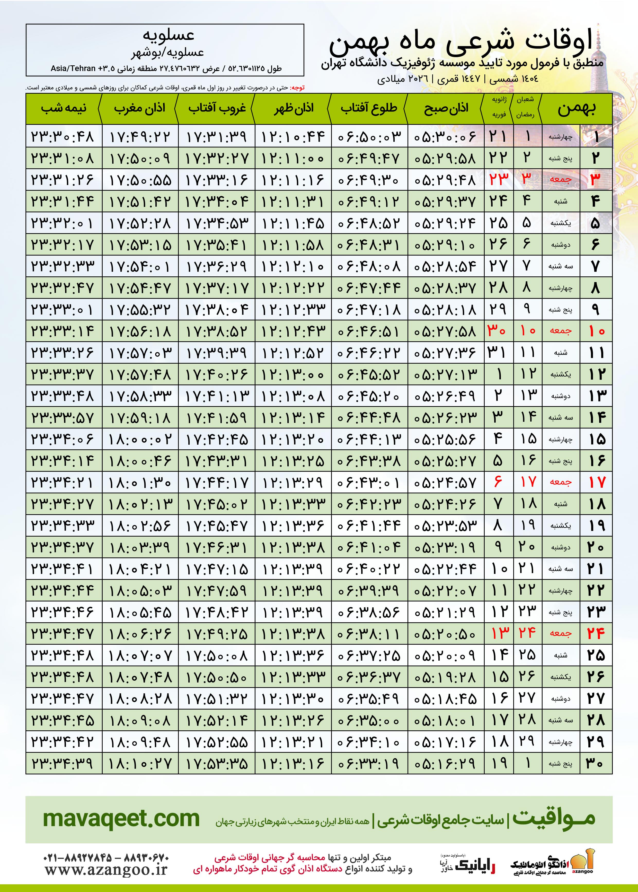 جدول اوقات شرعی بهمن ٠٤ / ١٤٠٤ عسلویه دانلود pdf