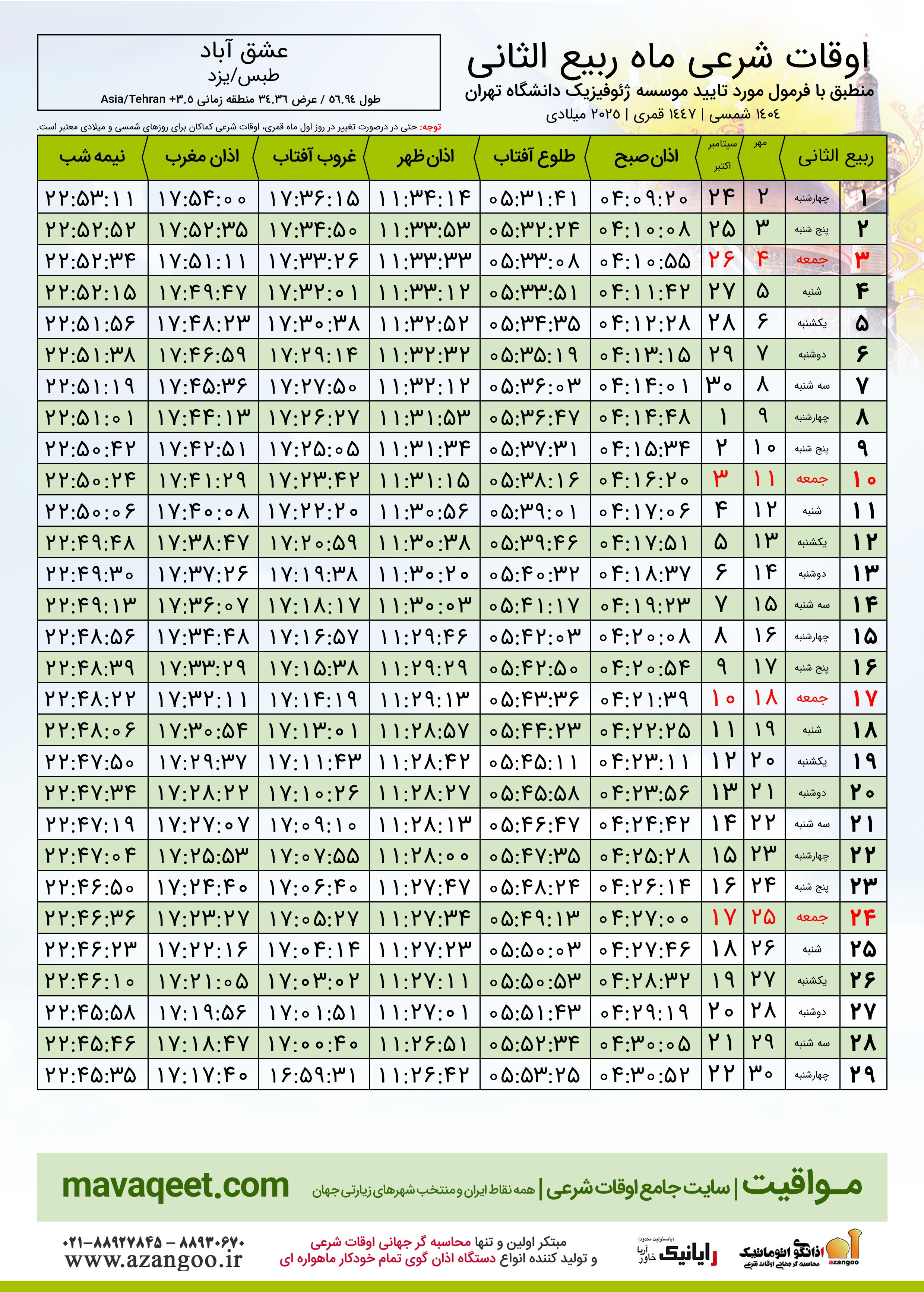 دانلود اوقات شرعی ماه ربیع الثانی ١٤٤٧ هـ.ق