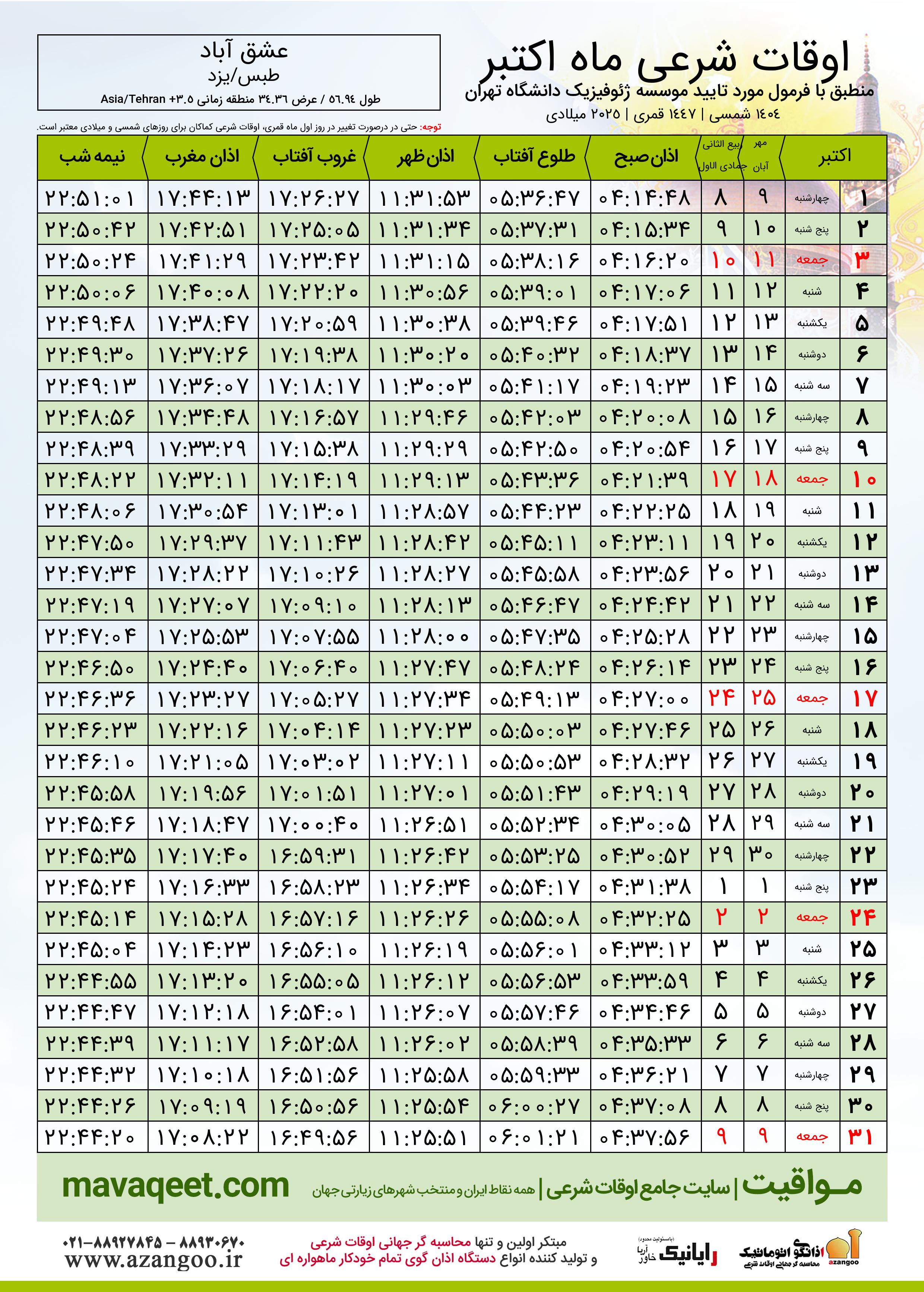 جهت نمایش تصویر جدول اوقات شرعی جدول اوقات شرعی اکتبر ٢٠٢٥ میلادی شهر عشق آباد شهر عشق آباد در اندازه