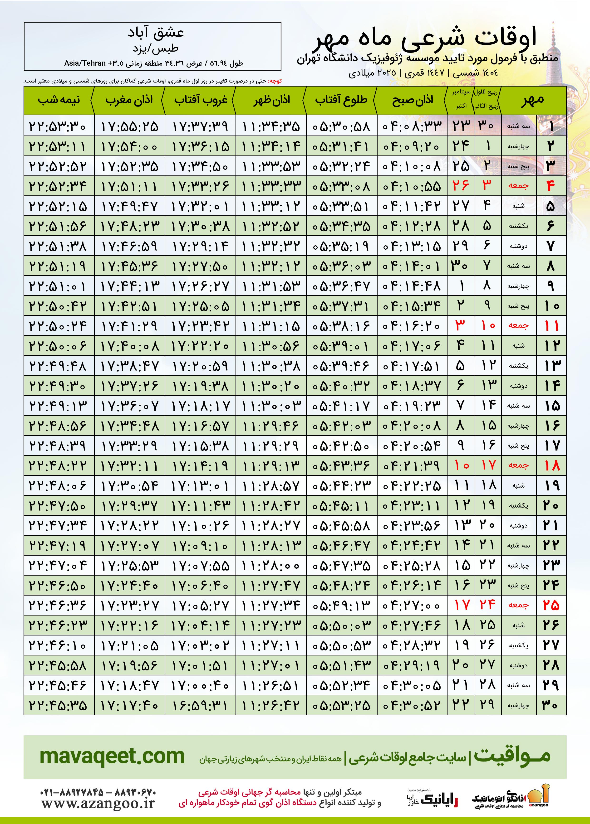 جدول اوقات شرعی مهر ١٤٠٤ شمسی شهر عشق آباد