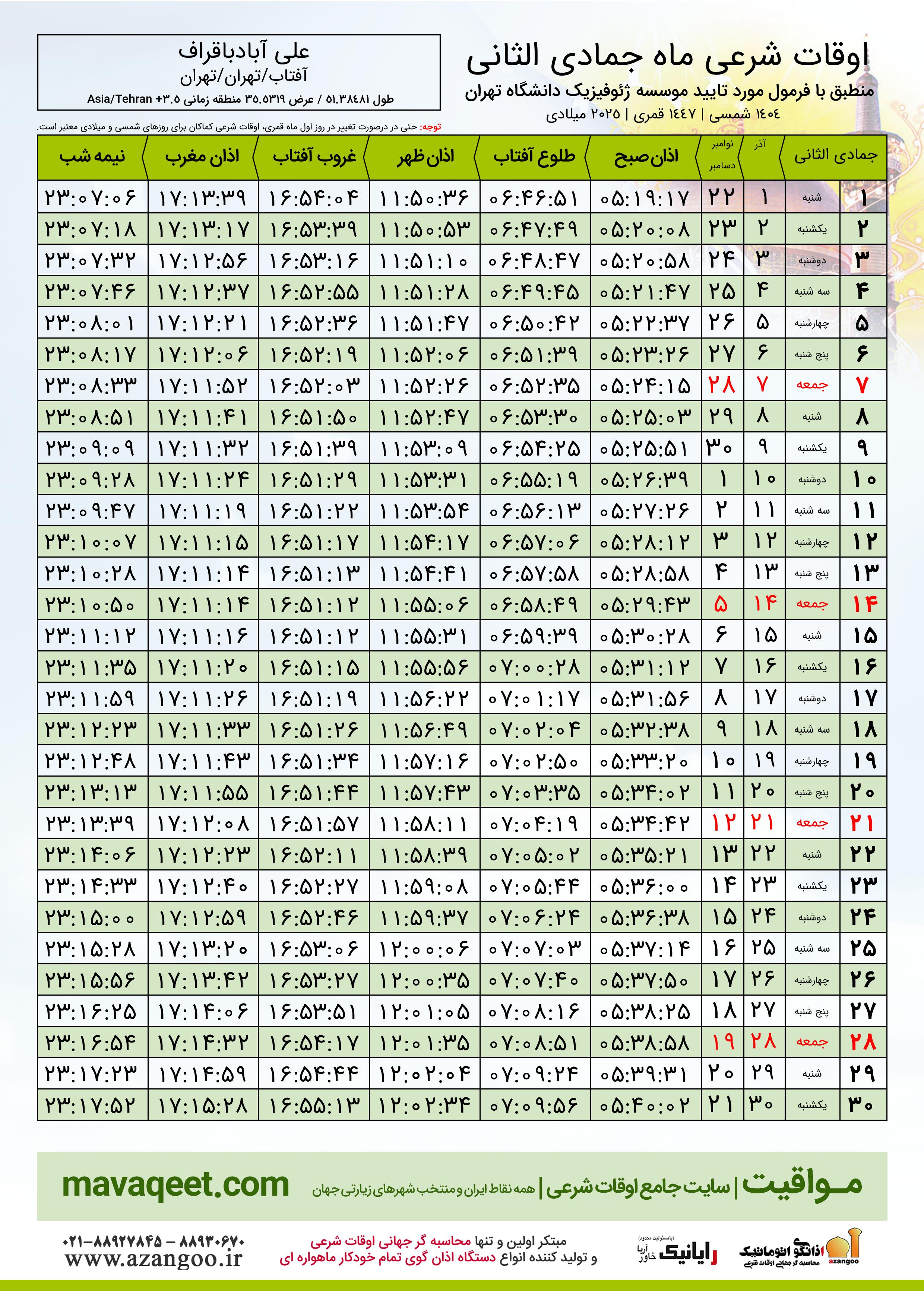 جدول اوقات شرعی جمادی الثانی ١٤٤٧ قمری روستای علی آبادباقراف