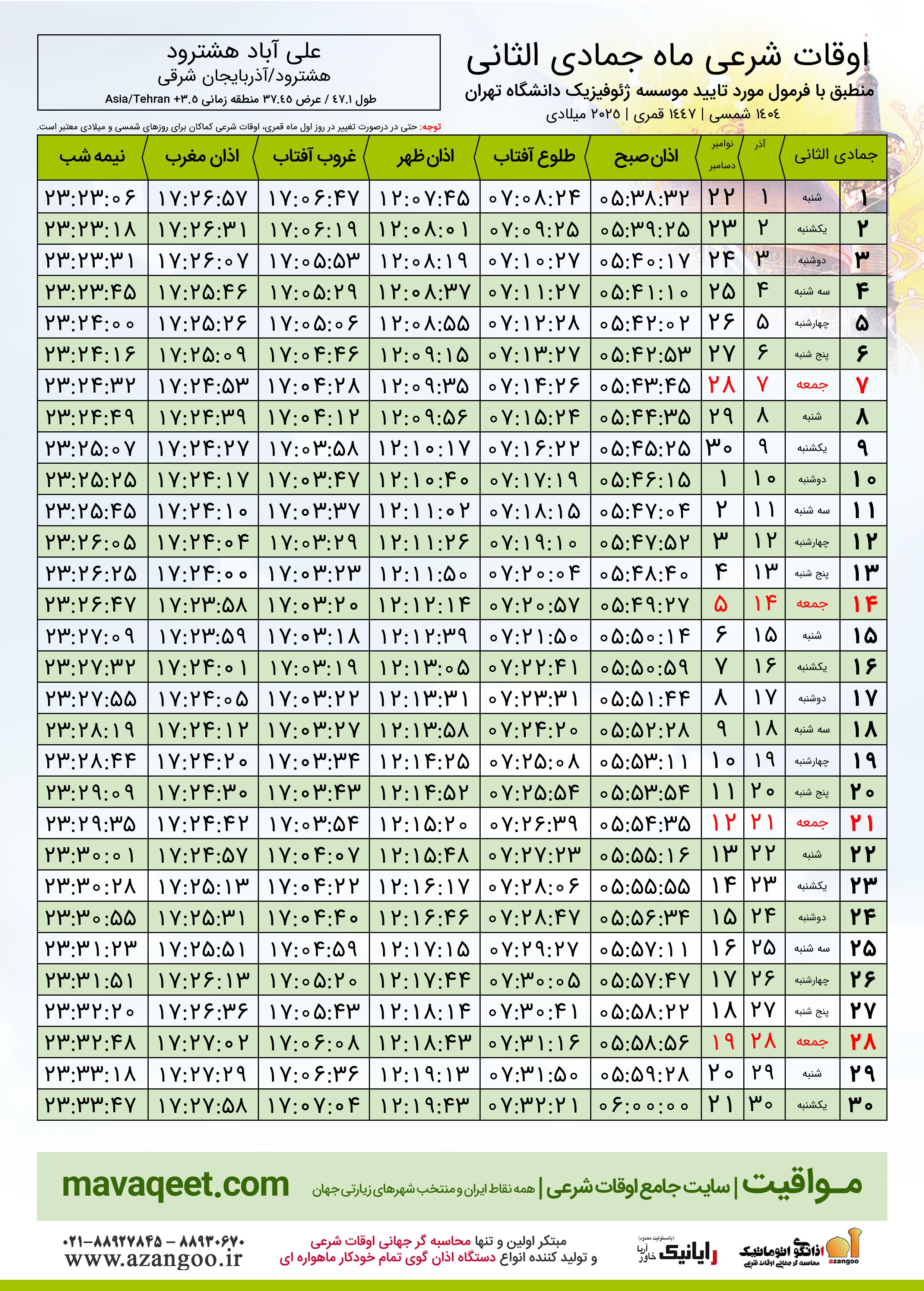 اوقات شرعی ماه جمادی الثانی ١٤٤٧ هـ.ق شهر علی آباد هشترود بر