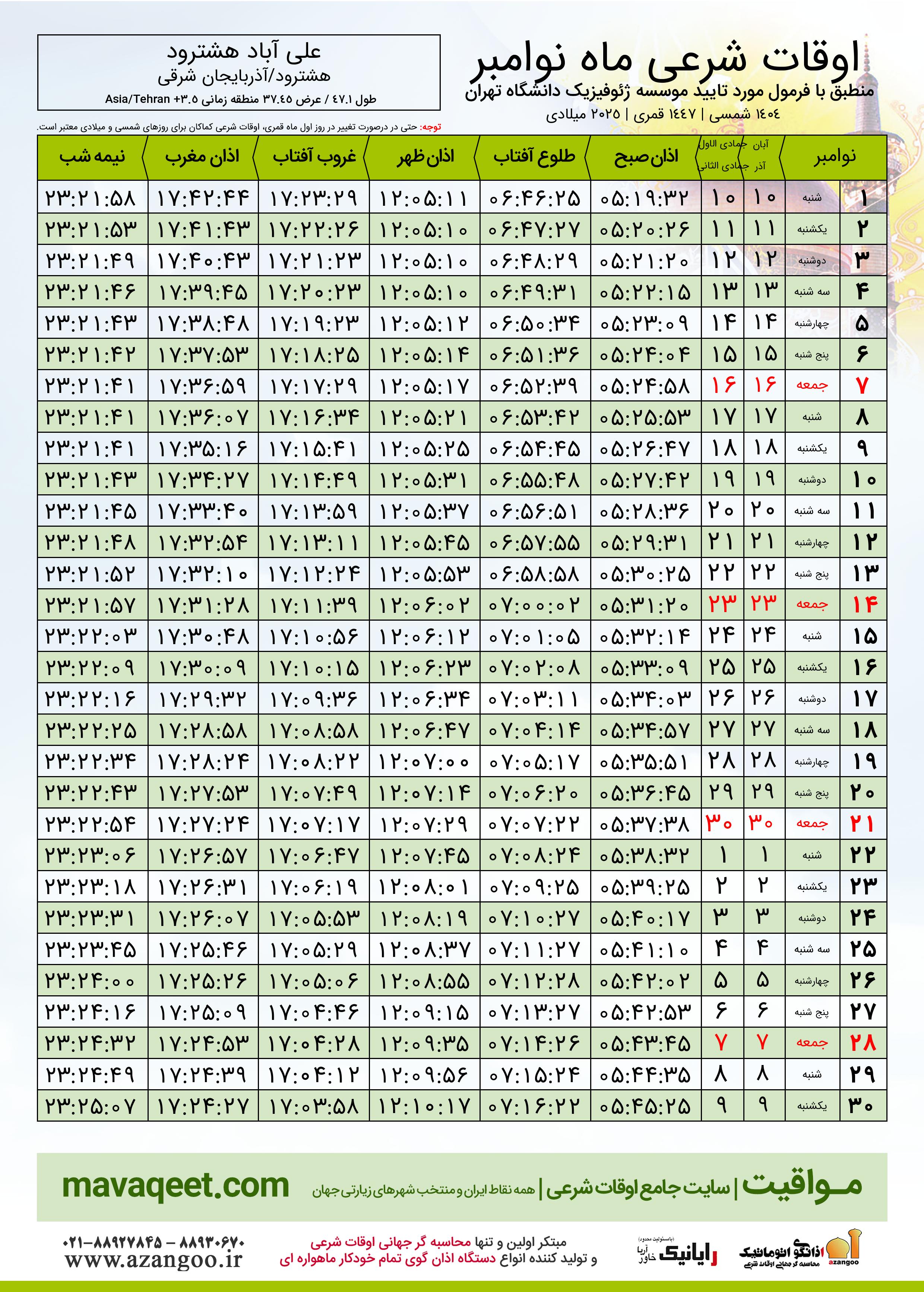 اوقات شرعی آبان ١٤٠٤ شمسی شهر علی آباد هشترود