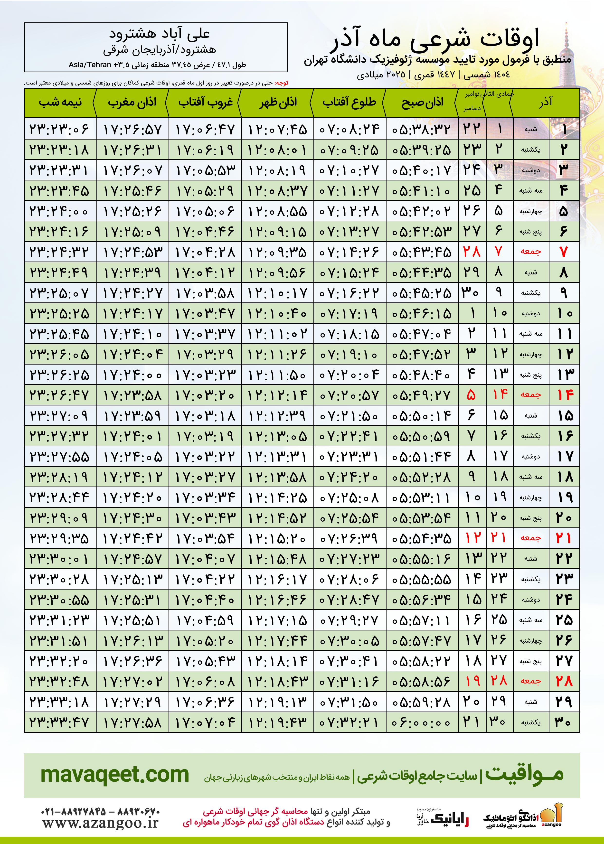 دانلود اوقات شرعی آذر ٠٤ - ١٤٠٤ شهر علی آباد هشترود