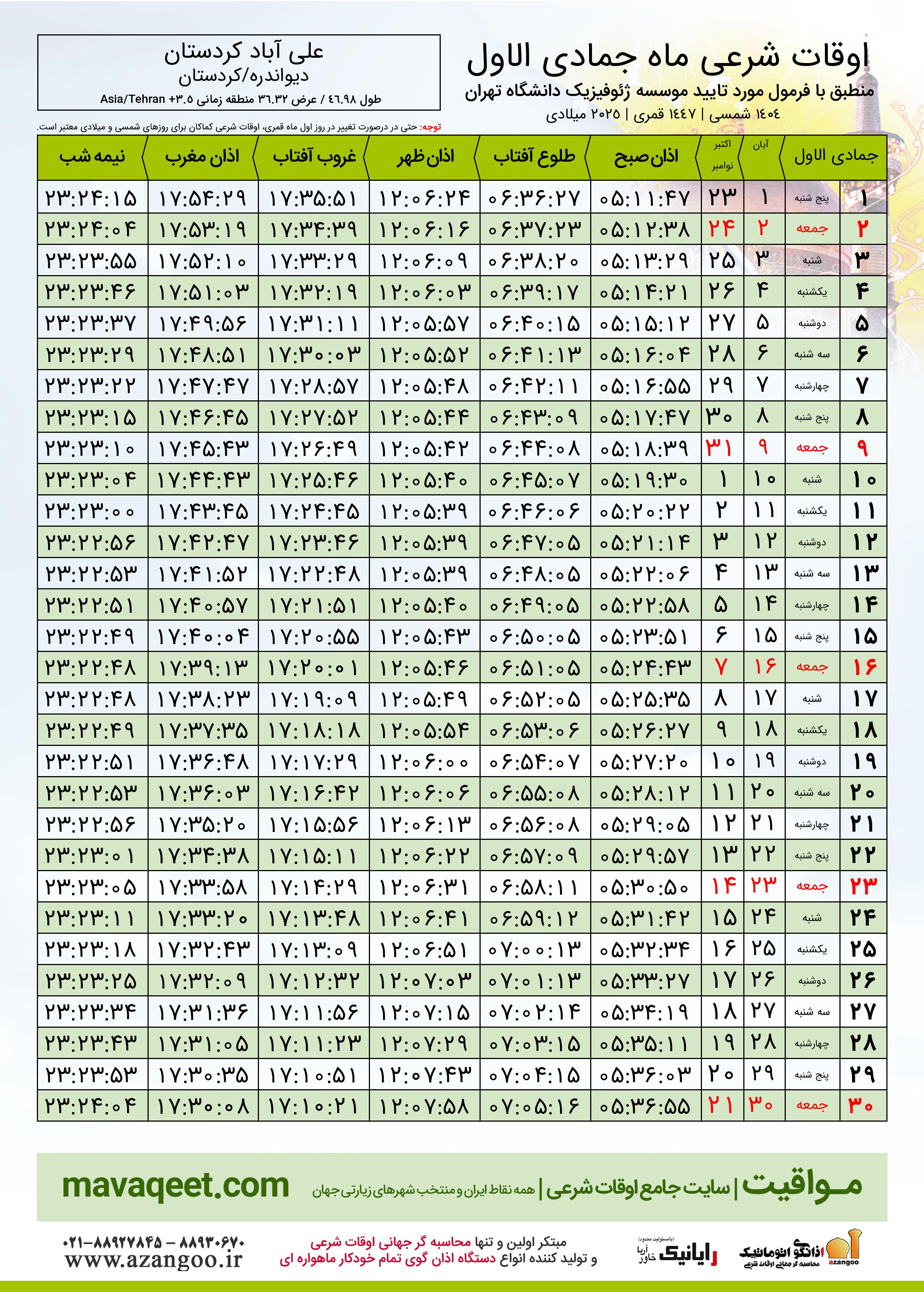 اوقات شرعی ماه جمادی الاول ١٤٤٧ هـ.ق شهر علی آباد کردستان بر
