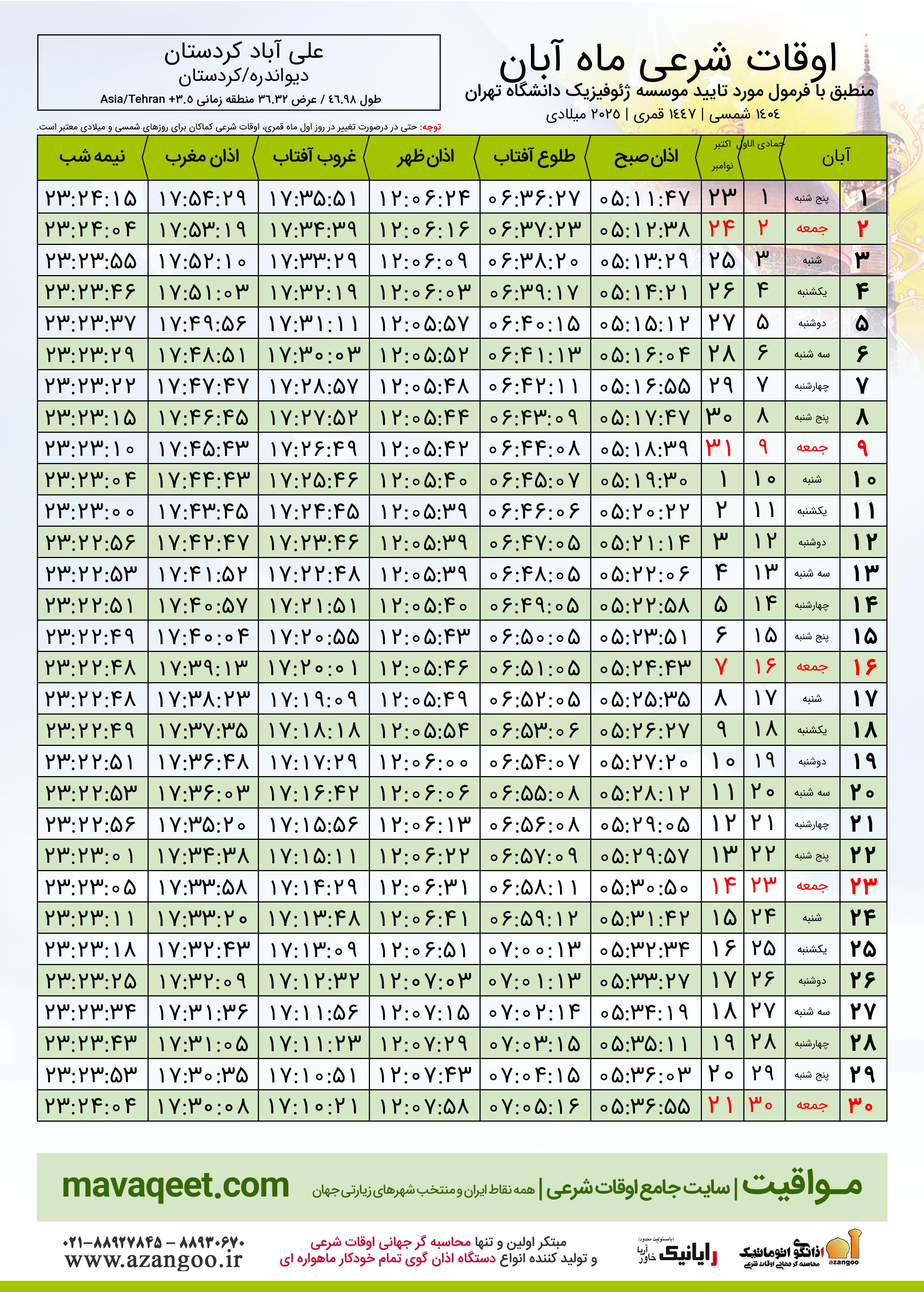 اوقات شرعی آبان ١٤٠٤ شمسی شهر علی آباد کردستان