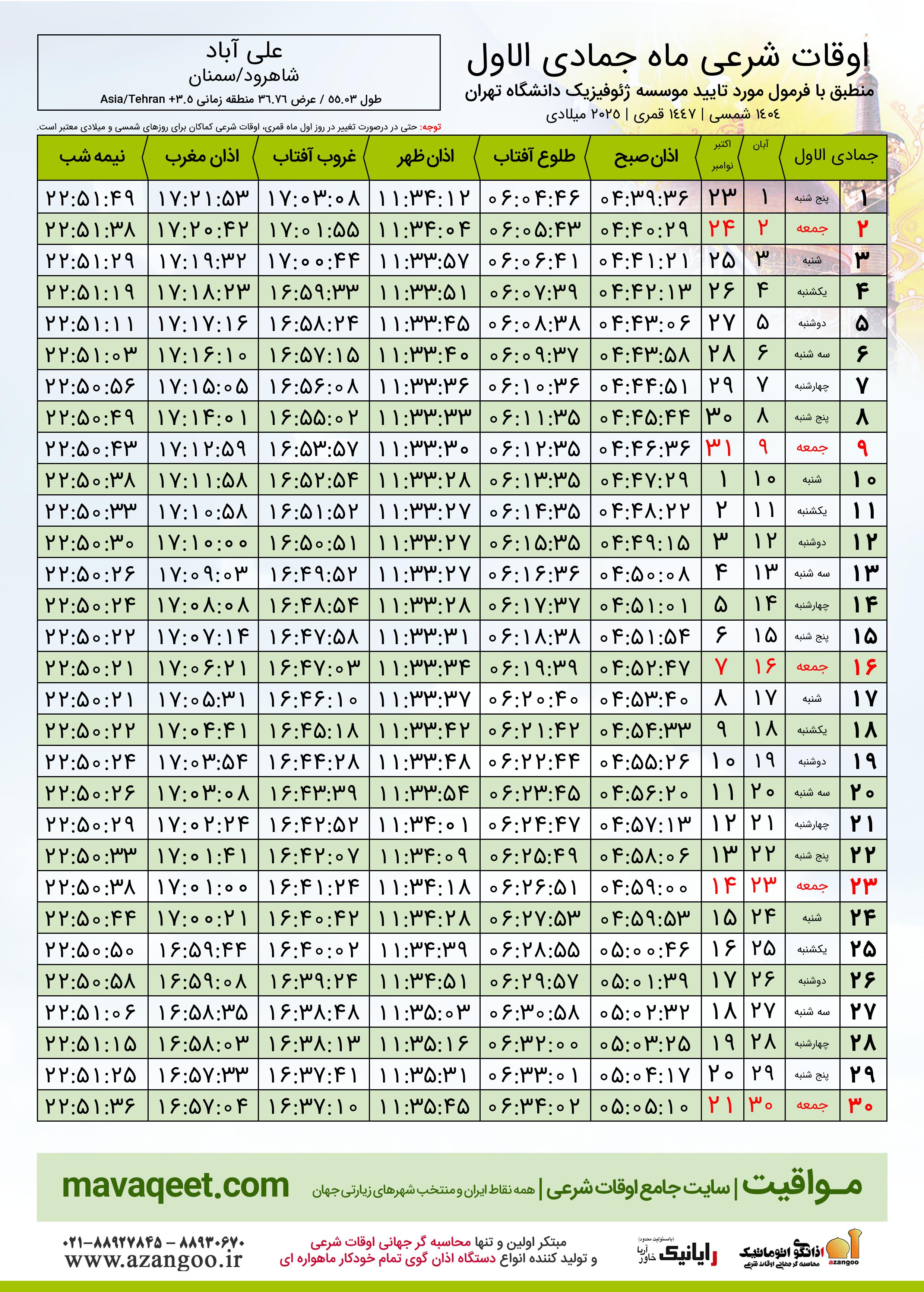 جدول اوقات شرعی جمادی الاول ١٤٤٧ قمری شهر علی آباد