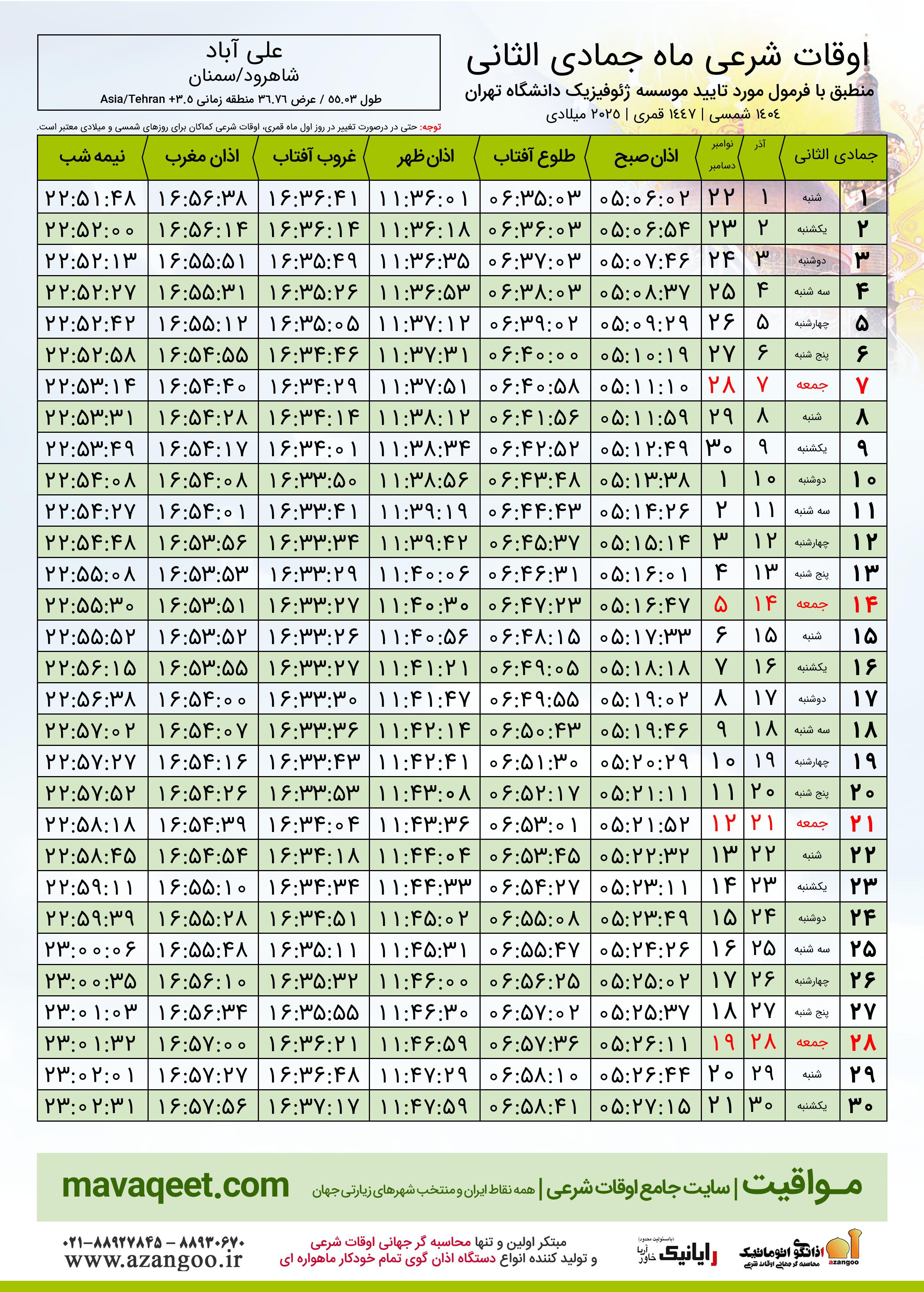 جدول اوقات شرعی جمادی الثانی ١٤٤٧ قمری شهر علی آباد