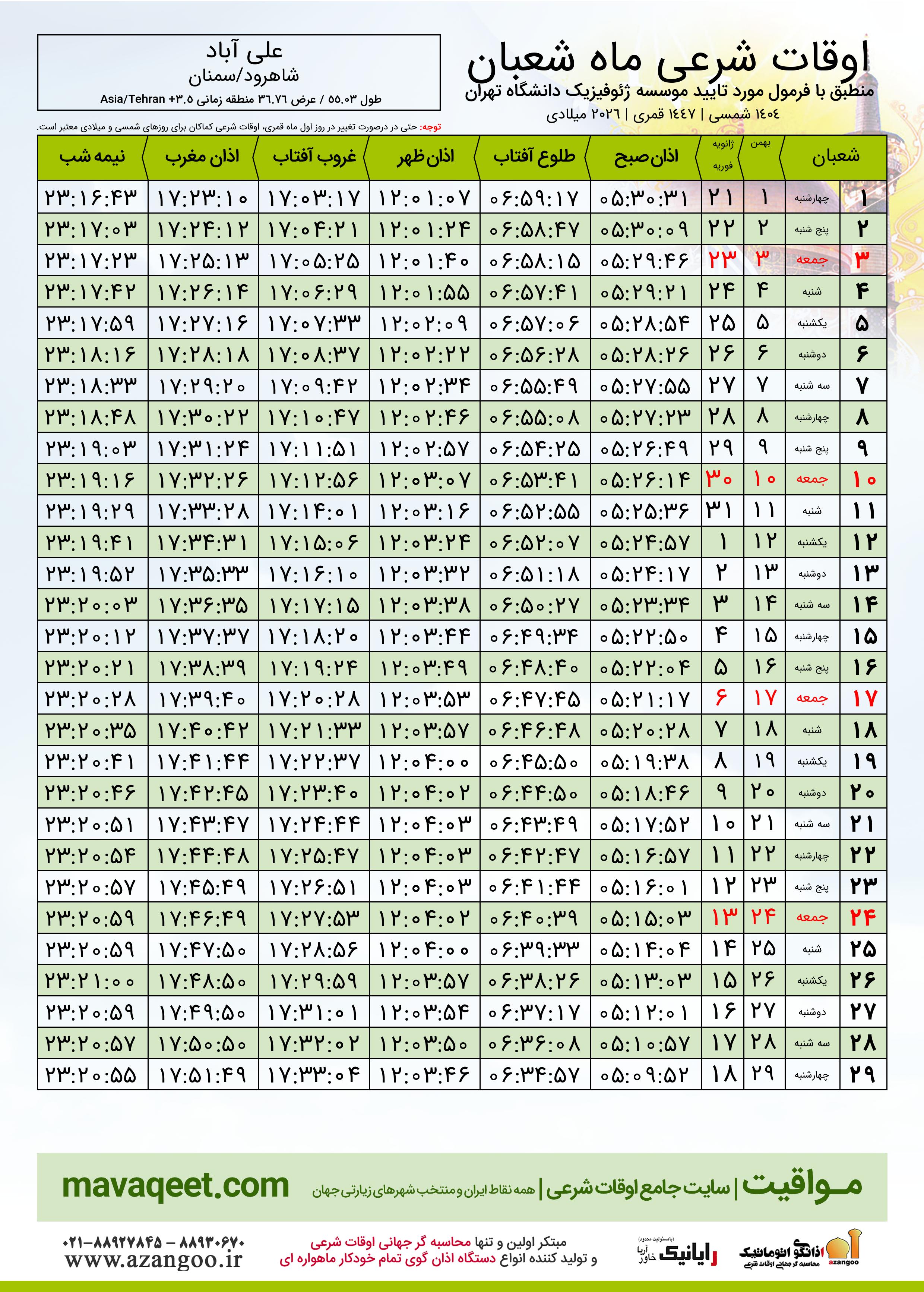 اوقات شرعی شعبان ١٤٤٧ قمری شهر علی آباد