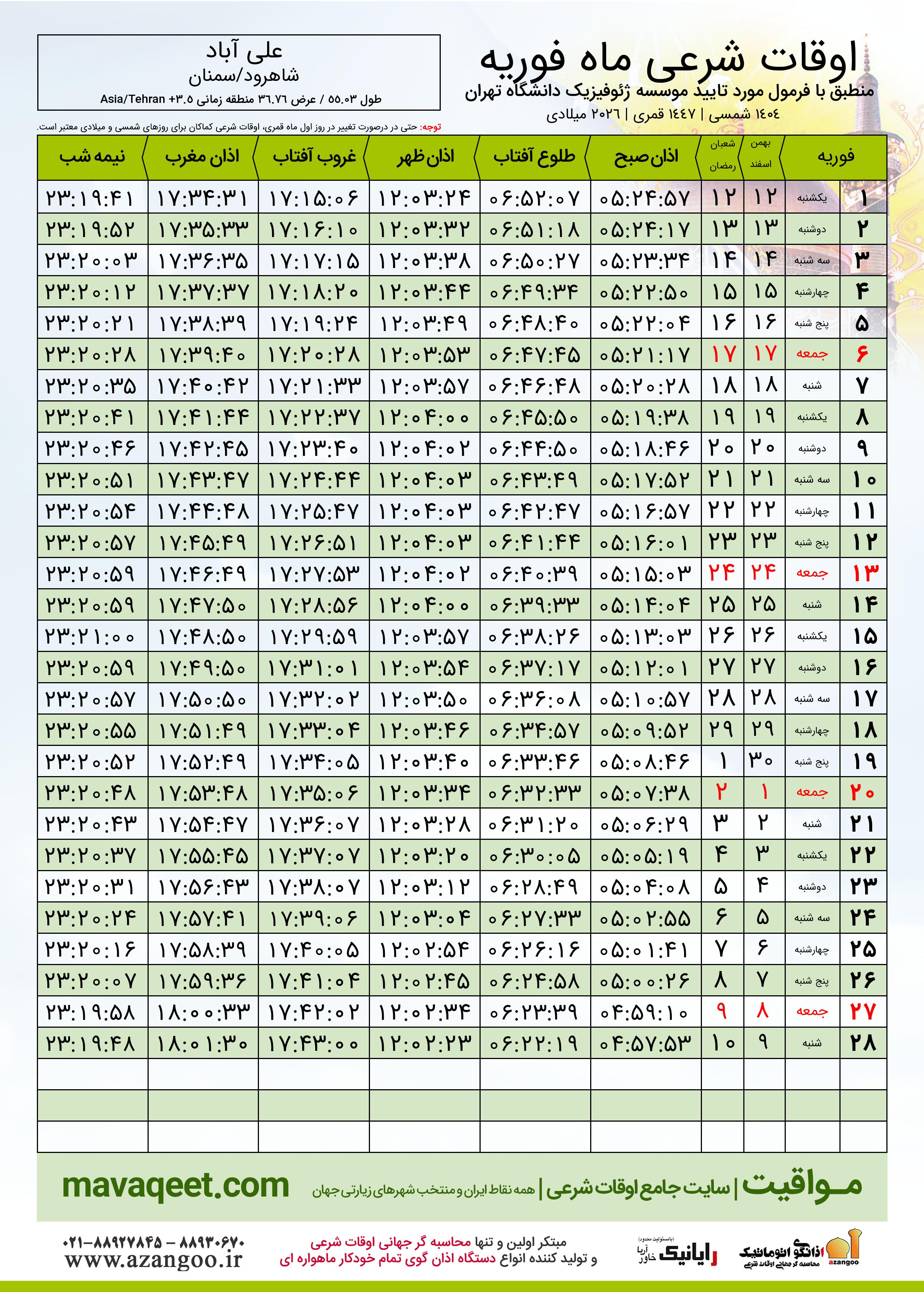 دانلود اوقات شرعی ماه رمضان ٠٤ - ١٤٠٤ شمسی | ٢٠٢٦ میلادی | ١٤٤٧ قمری شهر علی آباد