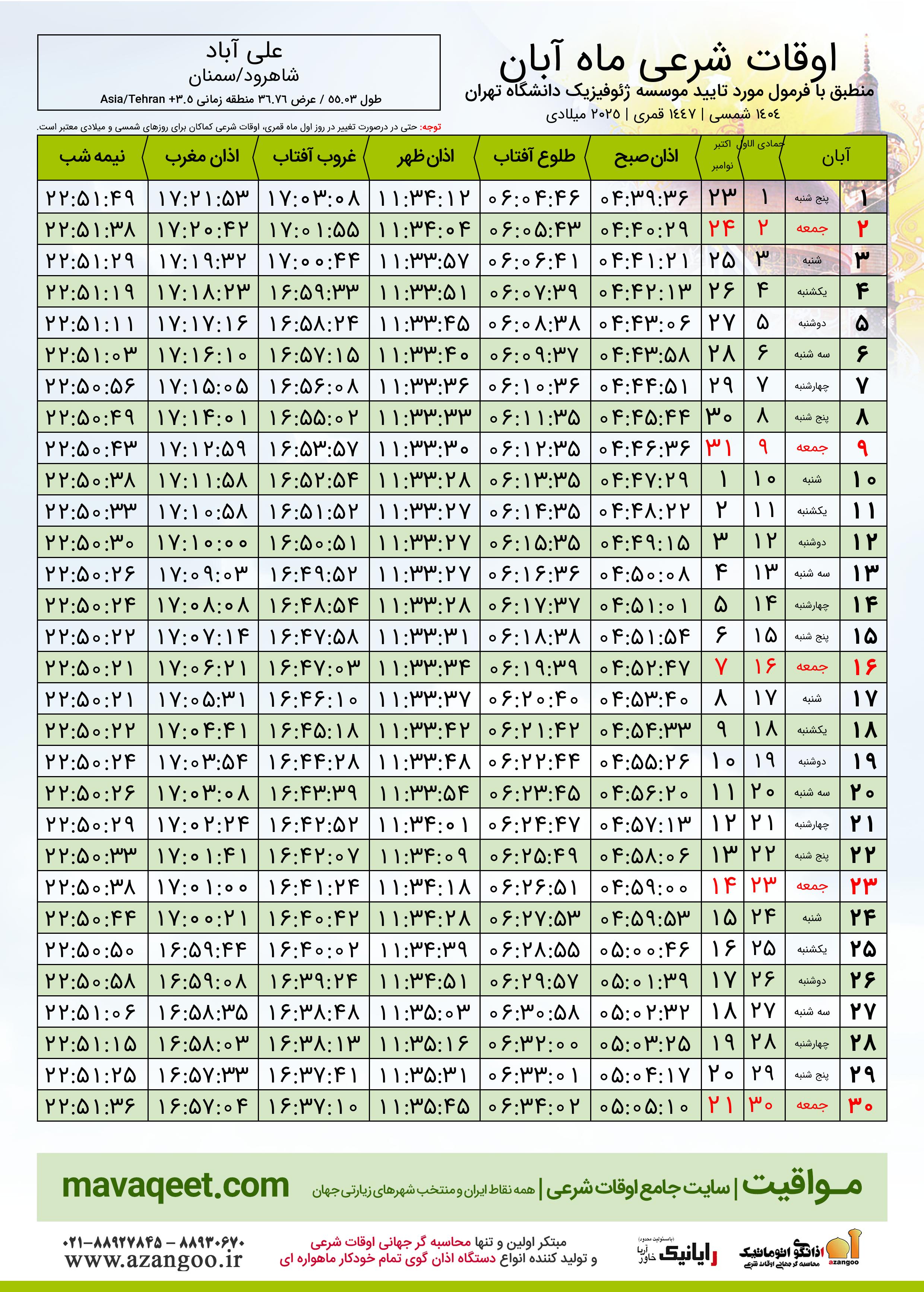 جدول اوقات شرعی آبان ١٤٠٤ شمسی شهر علی آباد