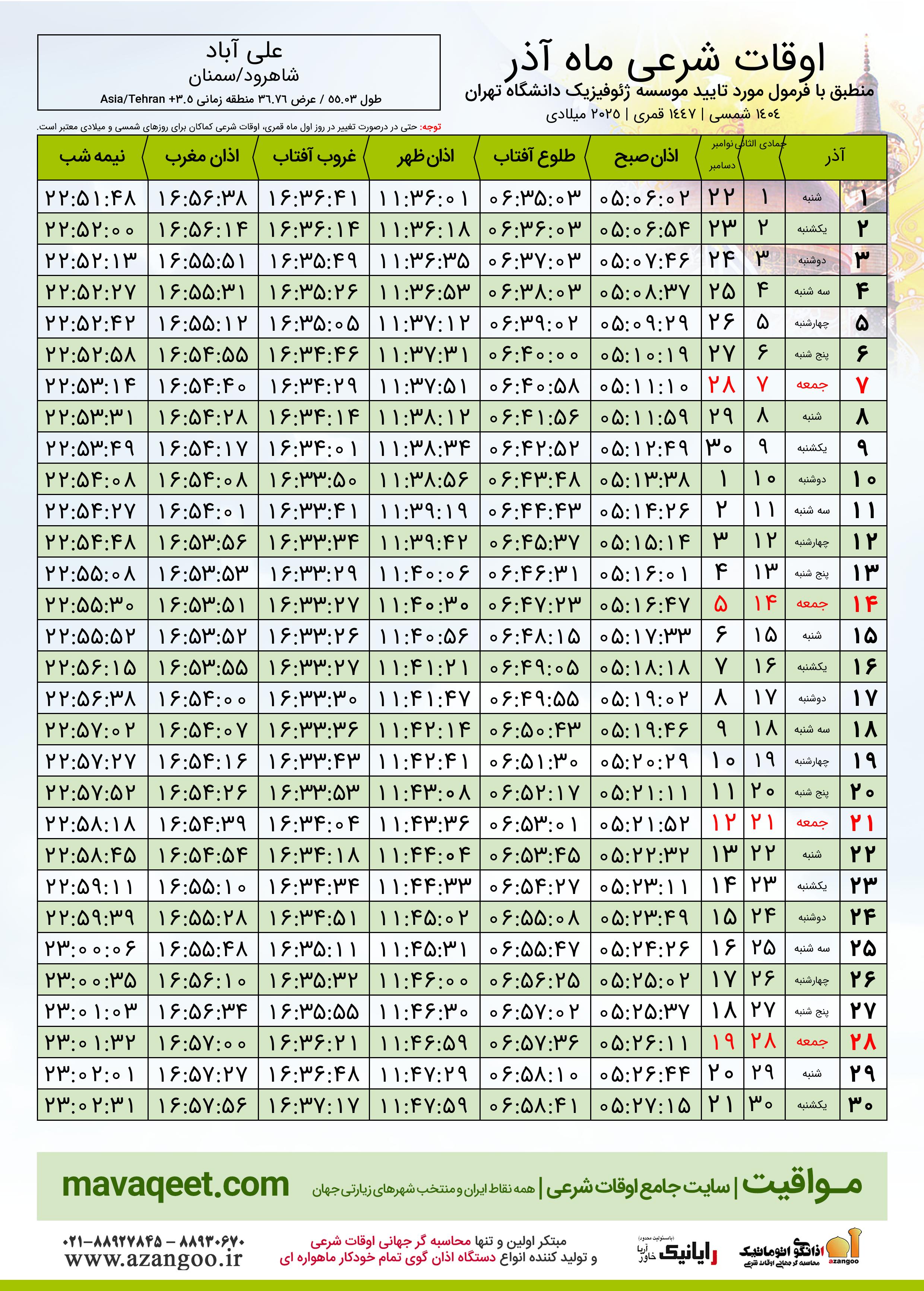 اوقات شرعی نوامبر ٢٠٢٥ شهر علی آباد + دانلود