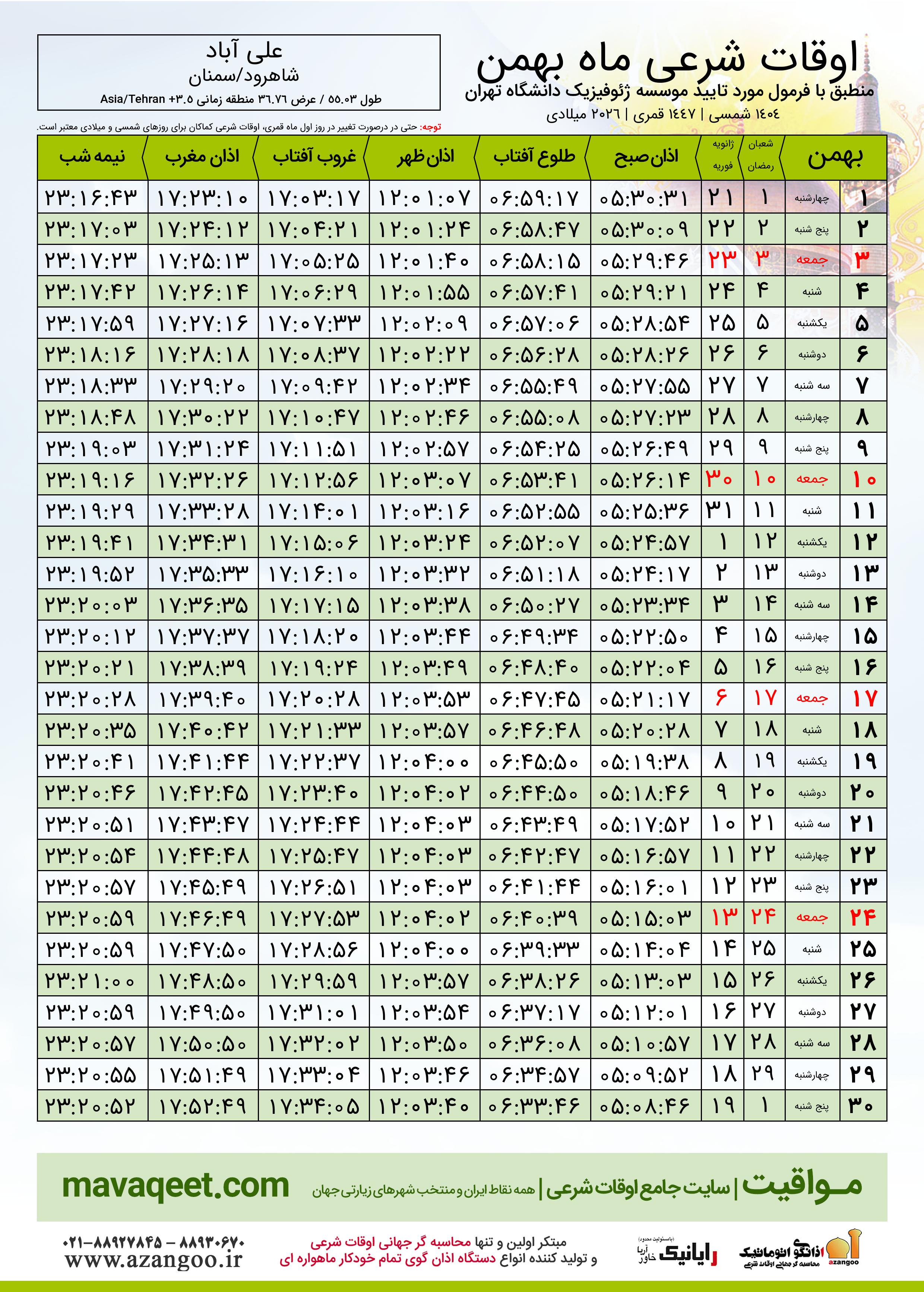 دانلود اوقات شرعی بهمن ٠٤ - ١٤٠٤ شهر علی آباد