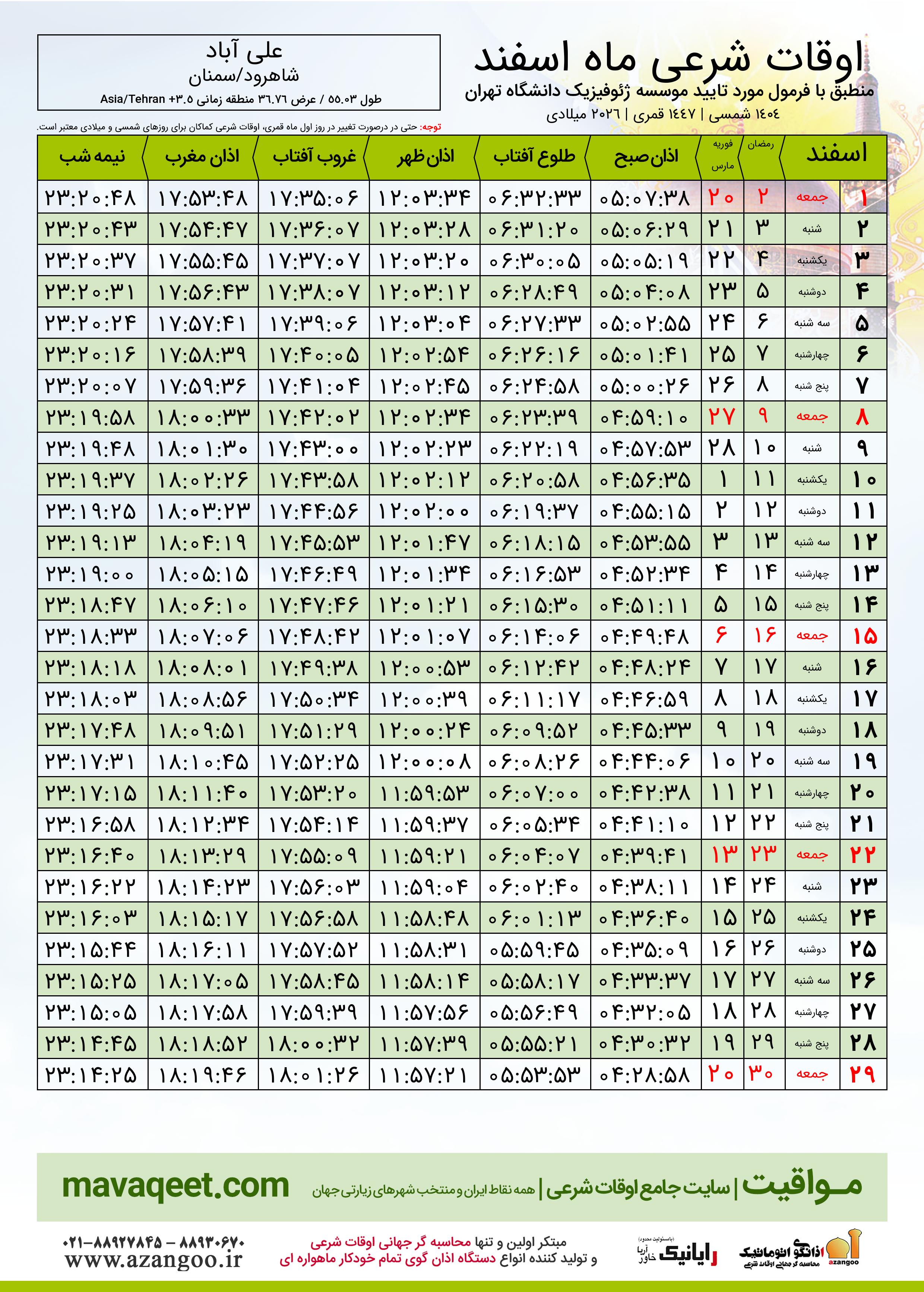 دانلود اوقات شرعی اسفند ٠٤ - ١٤٠٤ شهر علی آباد