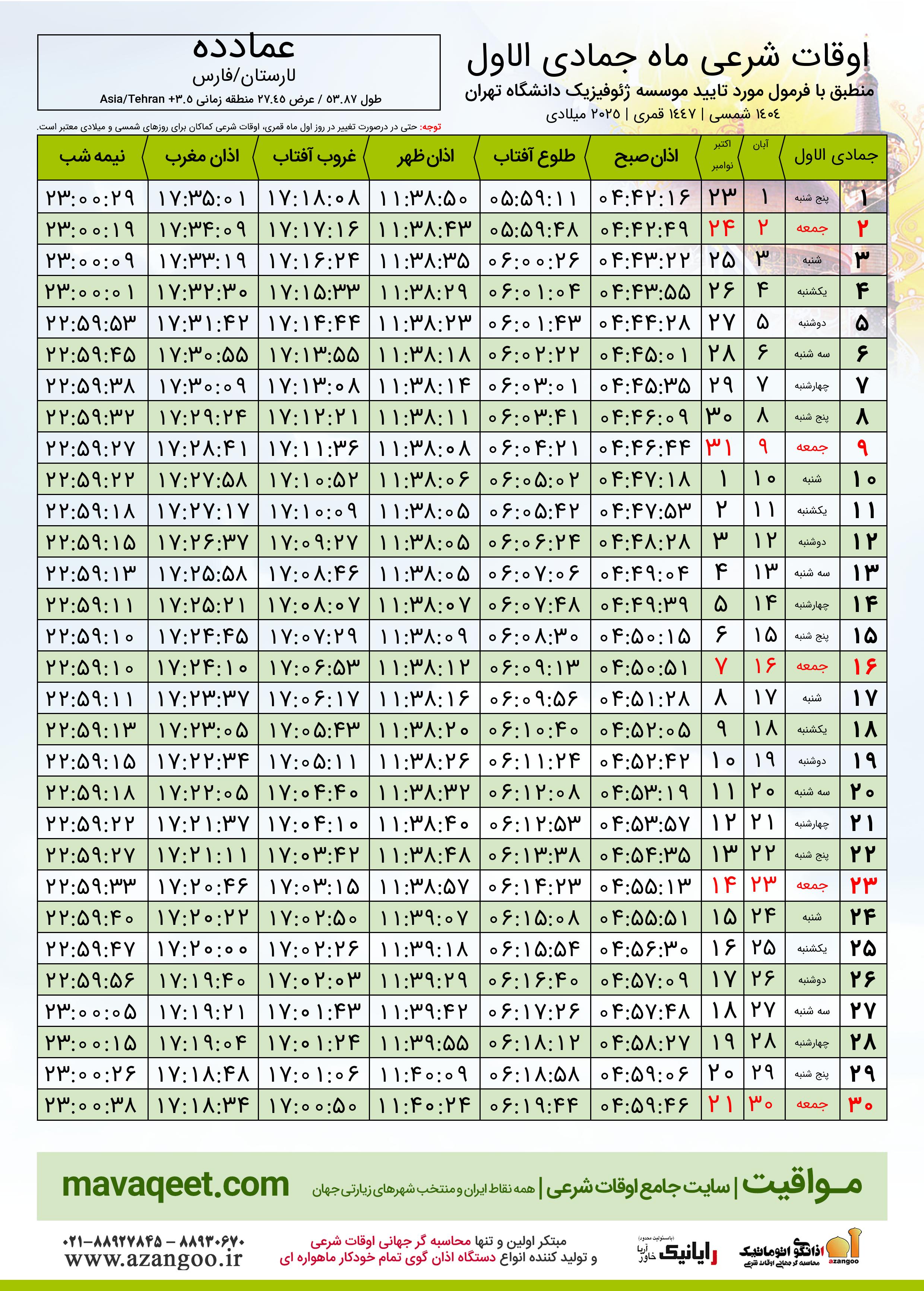 اوقات شرعی ماه جمادی الاول ١٤٤٧ هـ.ق شهر عمادده بر