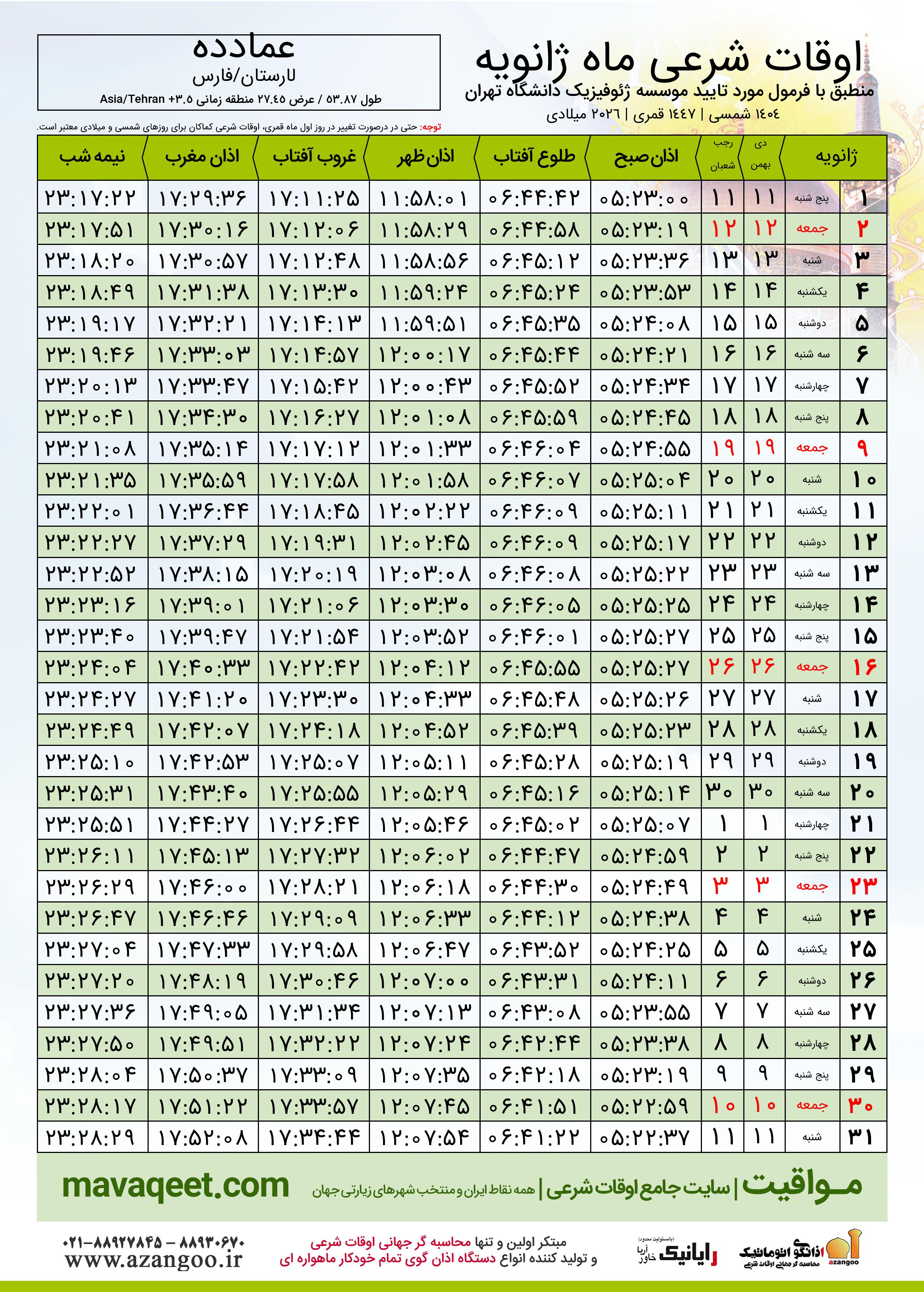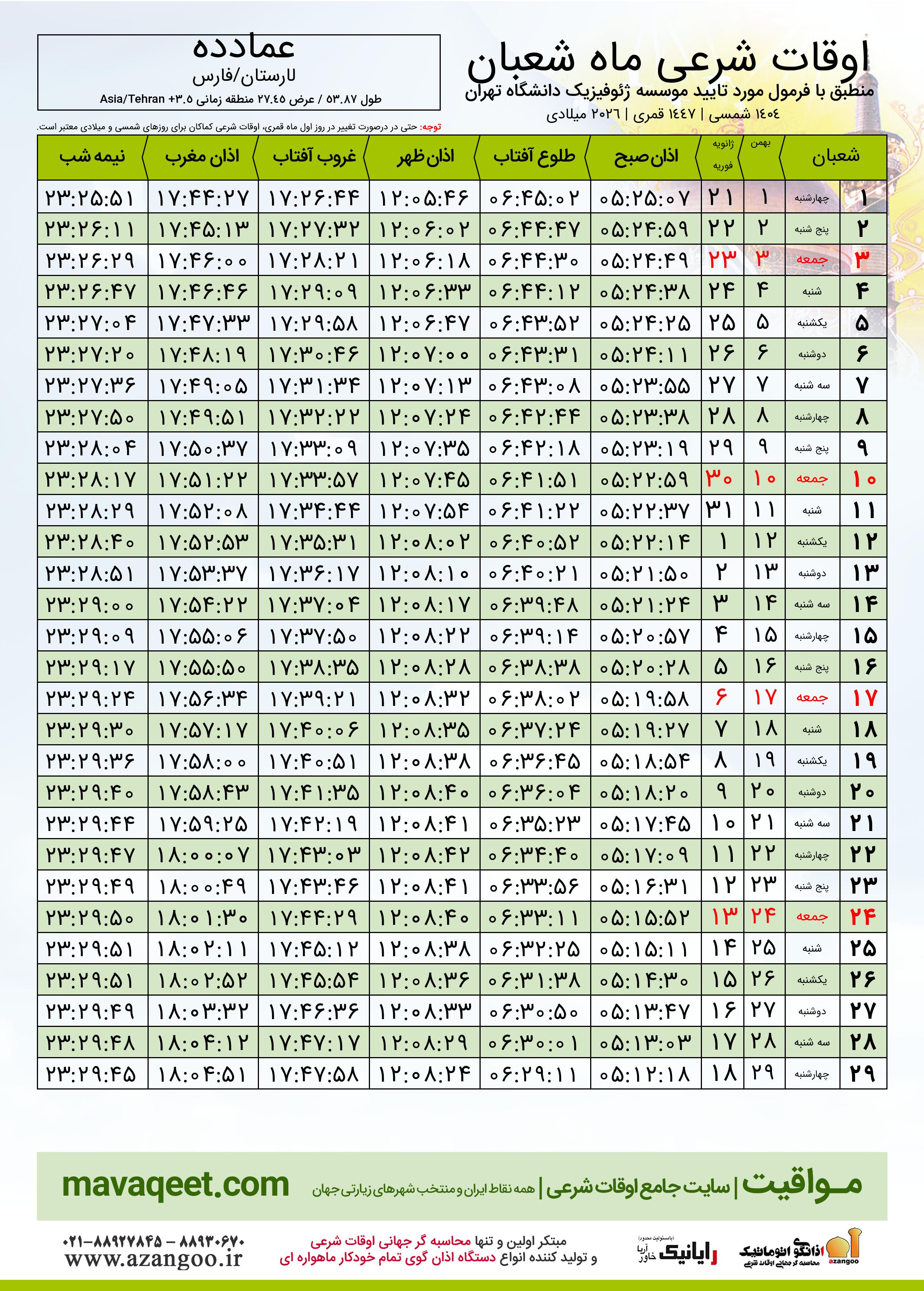 اوقات شرعی ماه شعبان ١٤٤٧ هـ.ق شهر عمادده بر