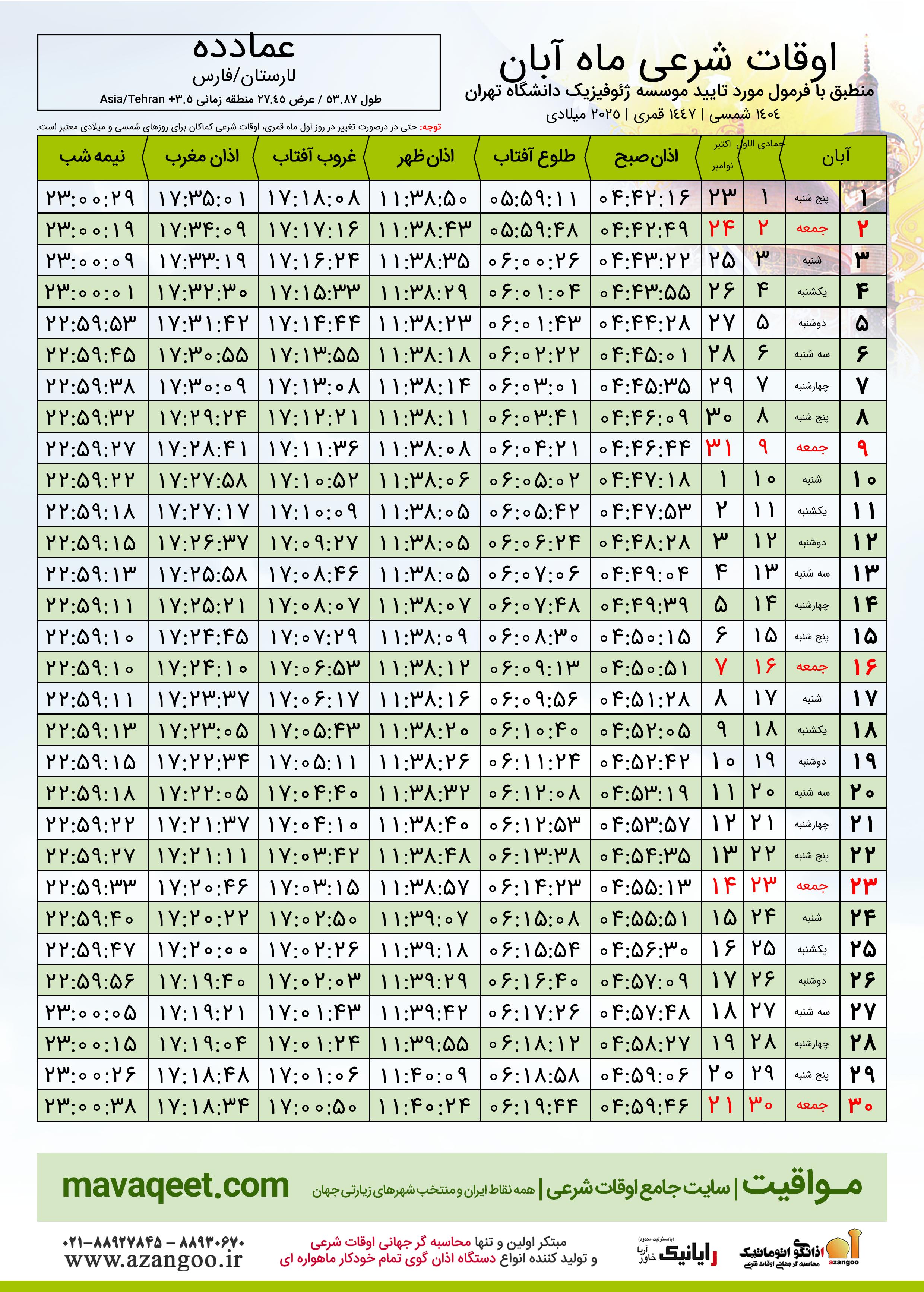 اوقات شرعی آبان ١٤٠٤ شمسی شهر عمادده