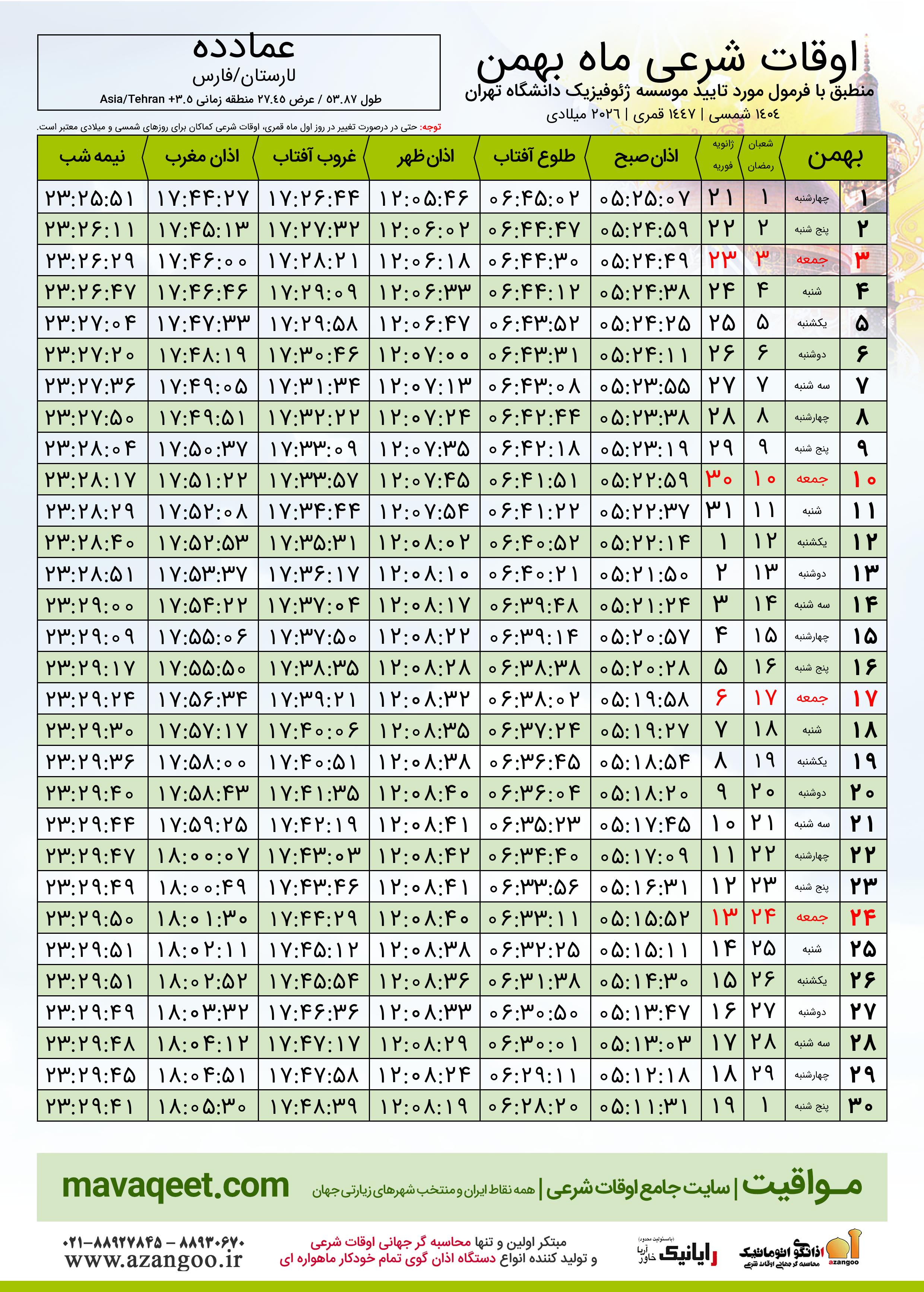 جدول اوقات شرعی بهمن ١٤٠٤ شمسی شهر عمادده