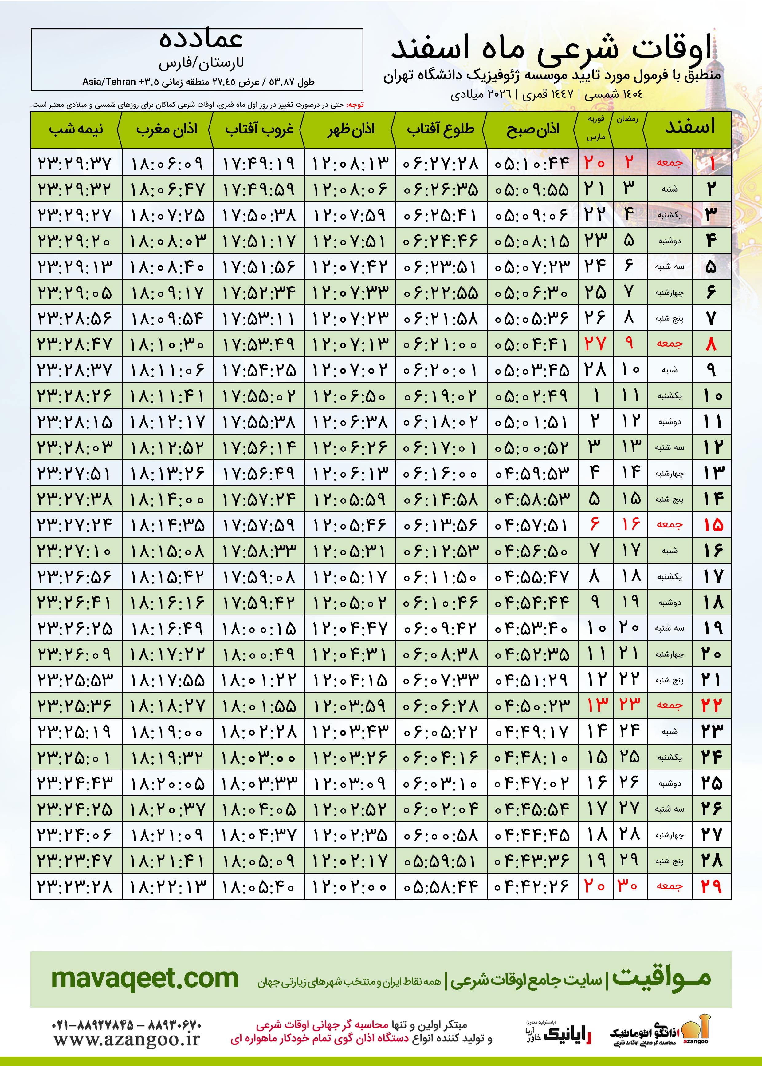 اوقات شرعی رمضان ١٤٤٧ شهر عمادده + دانلود