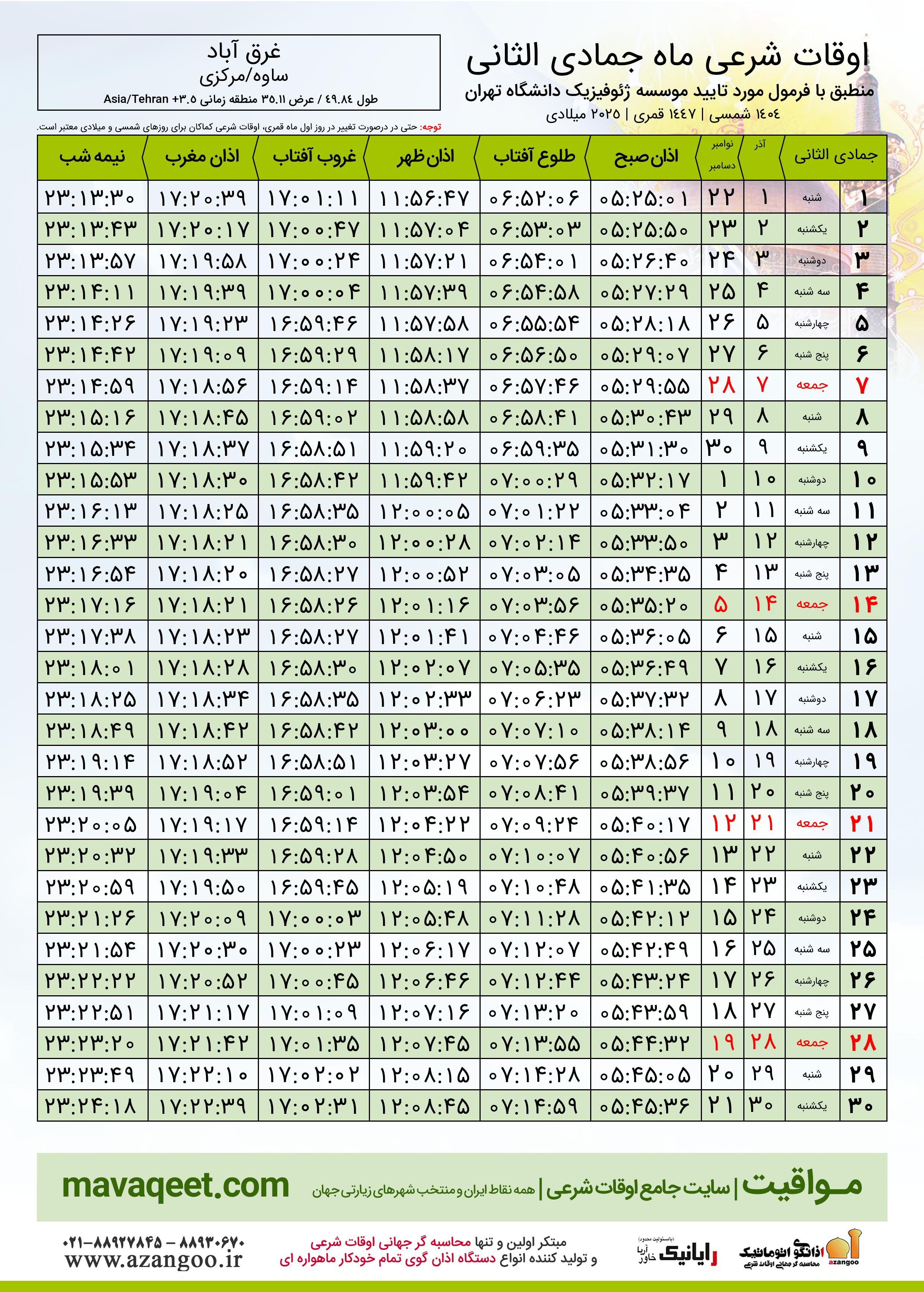 اوقات شرعی ماه جمادی الثانی ١٤٤٧ هـ.ق شهر غرق آباد بر