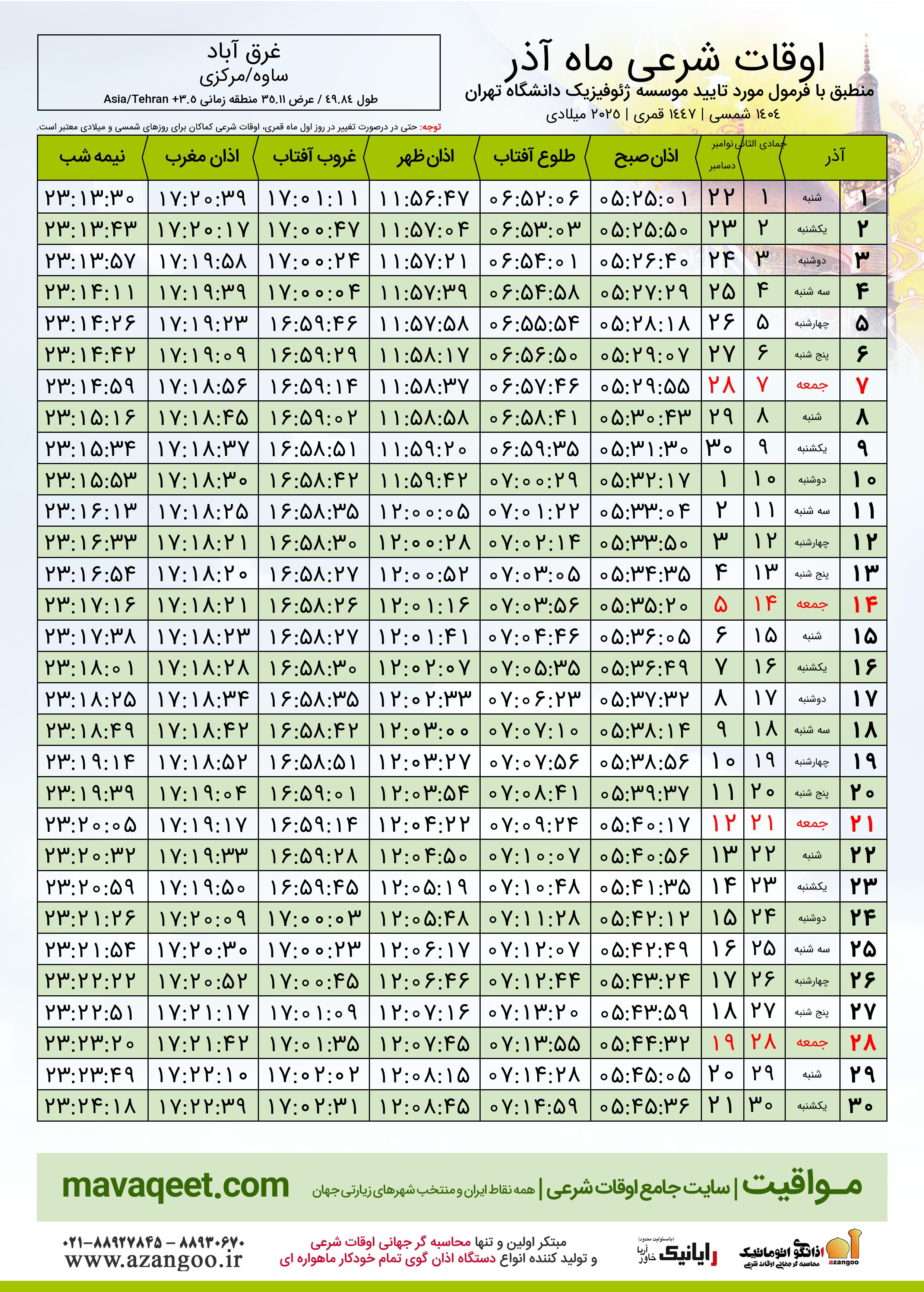 جهت نمایش تصویر جدول اوقات شرعی جدول اوقات شرعی آذر ١٤٠٤ شمسی شهر غرق آباد شهر غرق آباد در اندازه