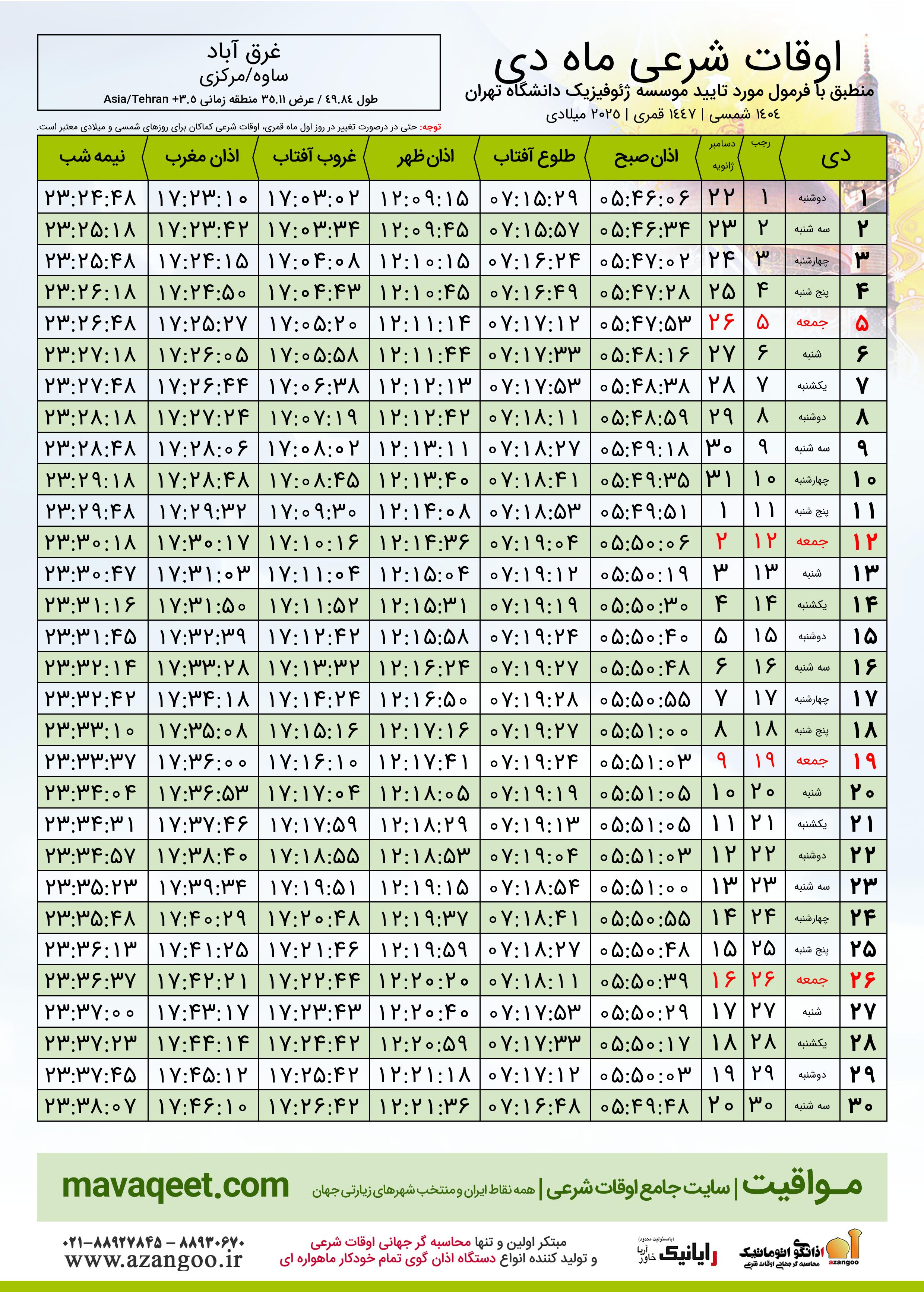 اوقات شرعی دی ١٤٠٤ شمسی شهر غرق آباد