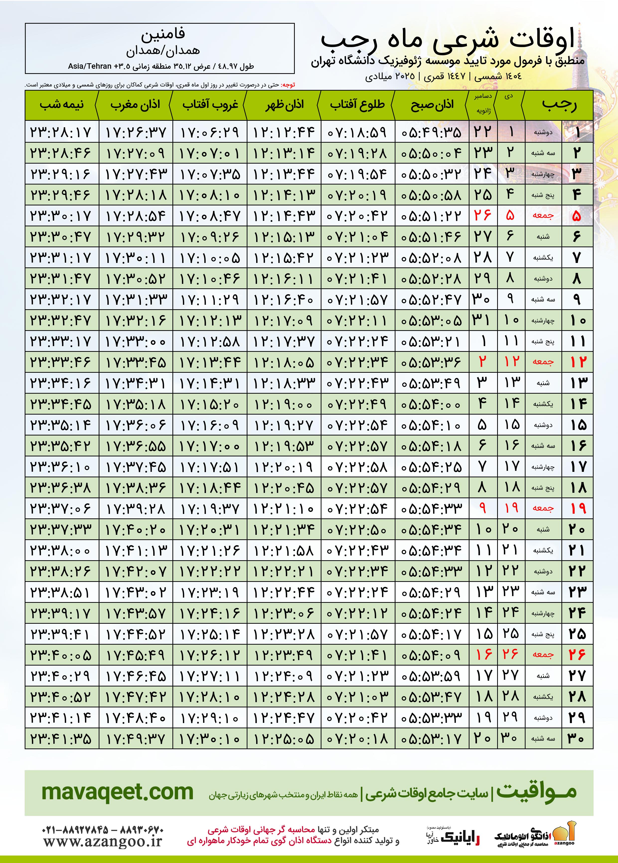 اوقات شرعی ماه رجب ١٤٤٧ هـ.ق شهر فامنین بر