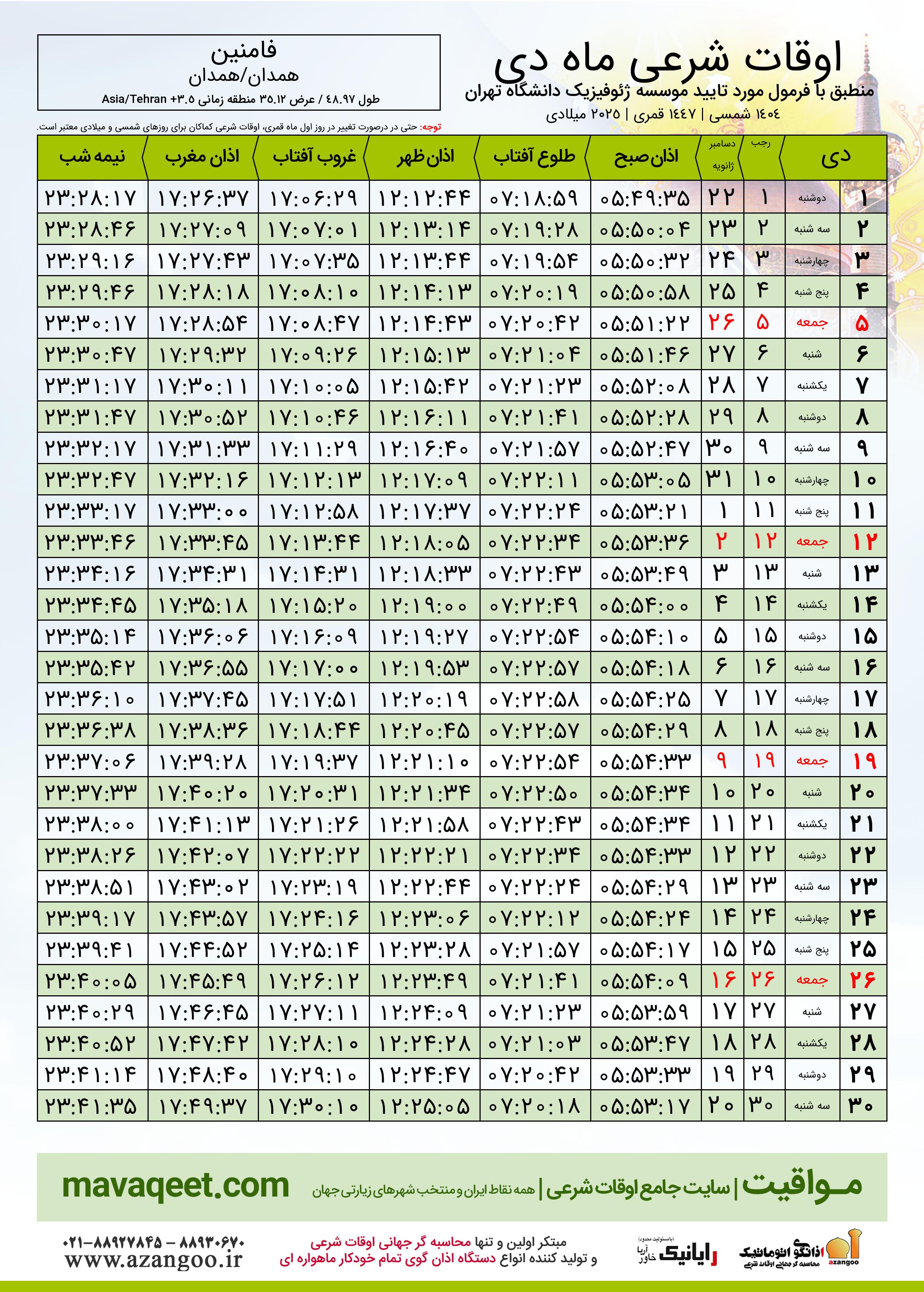 اوقات شرعی دی ١٤٠٤ شمسی شهر فامنین