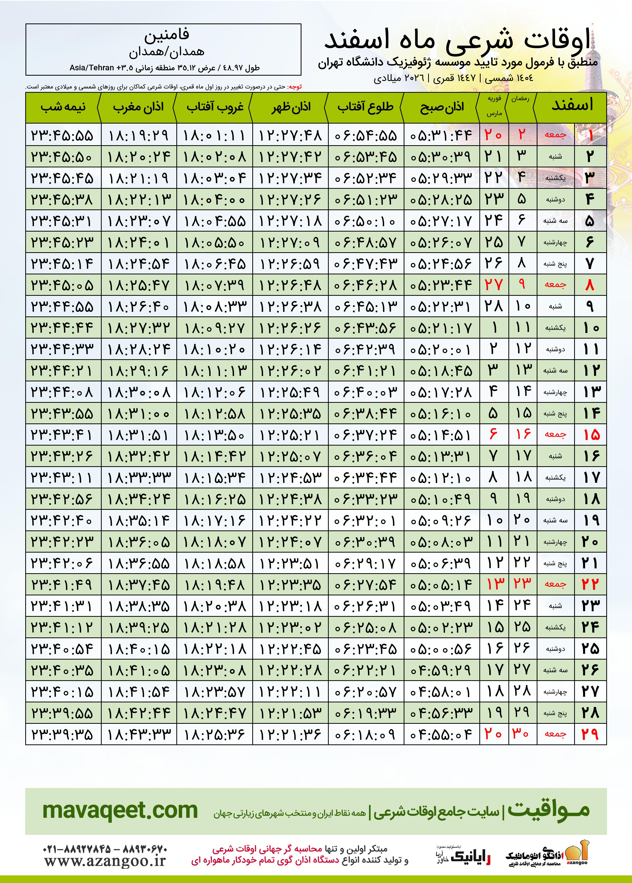 جدول اوقات شرعی ماه رمضان شهر فامنین ٠٤ - ١٤٠٤ شمسی | ٢٠٢٦ میلادی | ١٤٤٧ قمری