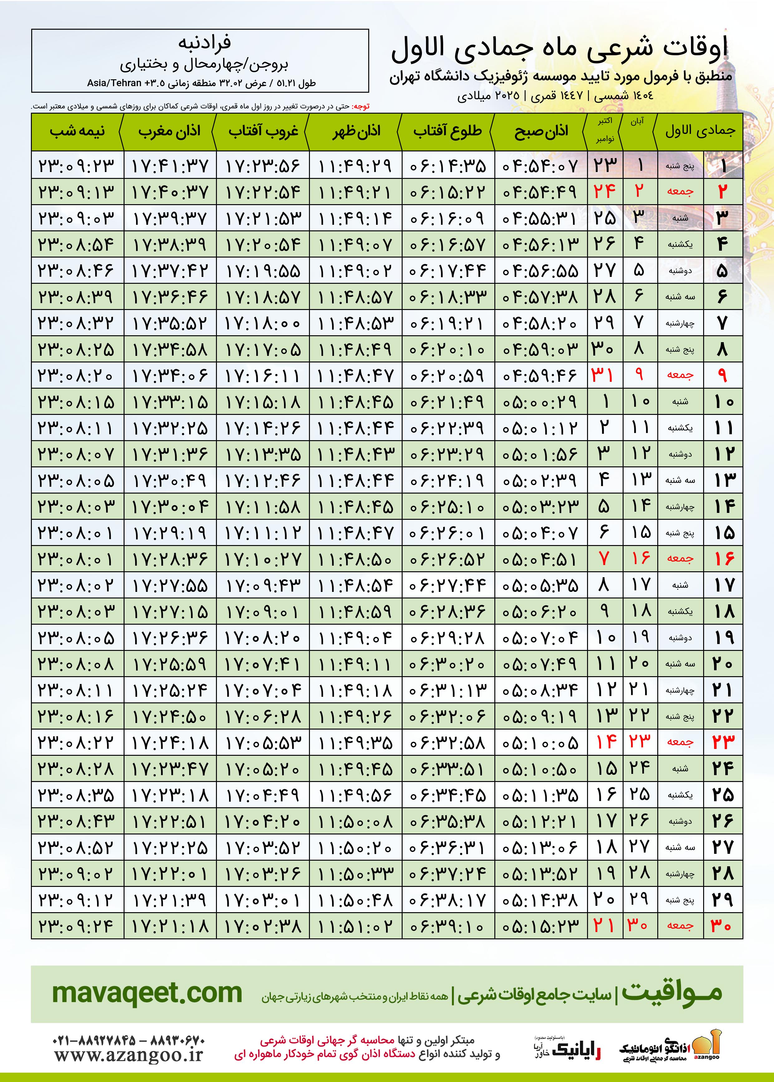 اوقات شرعی ماه جمادی الاول ١٤٤٧ هـ.ق شهر فرادنبه بر