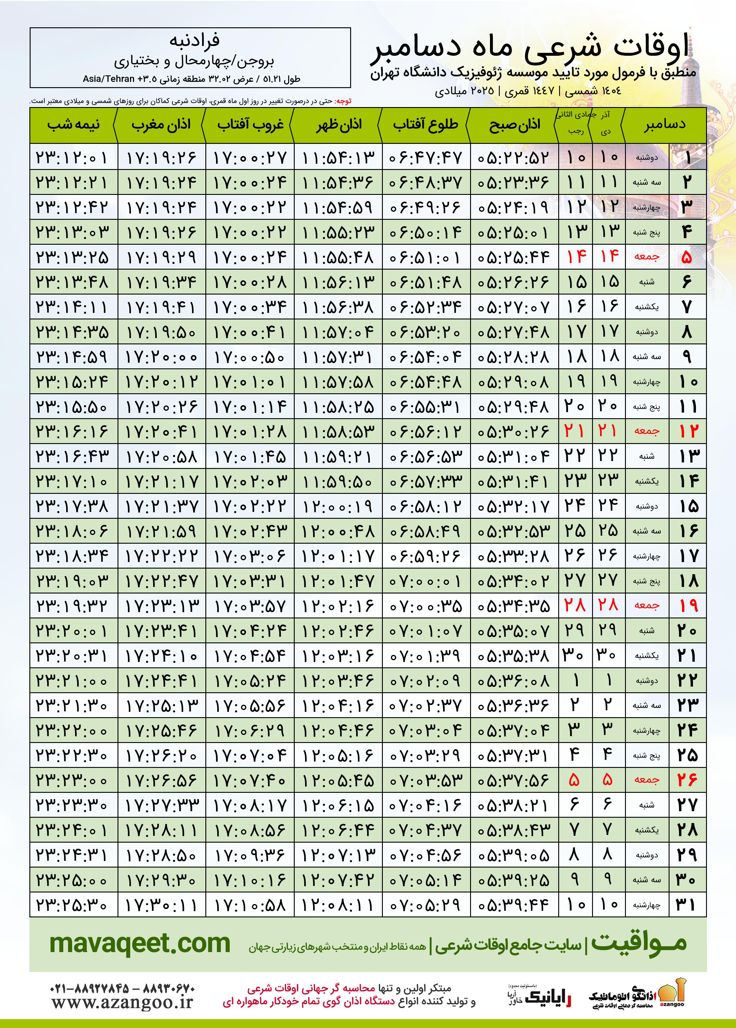 جدول اوقات شرعی دسامبر ٢٠٢٥ میلادی شهر فرادنبه