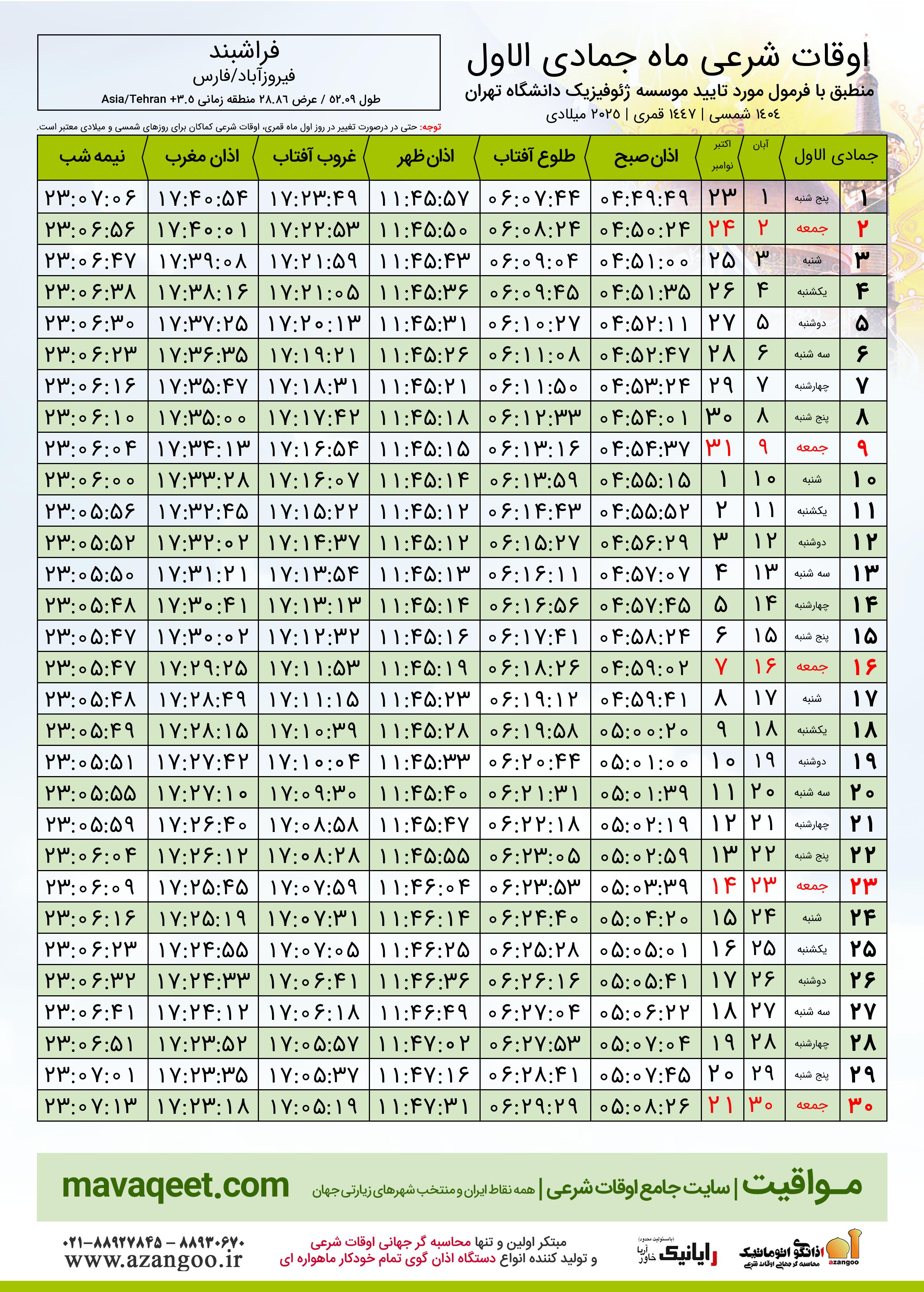 اوقات شرعی ماه جمادی الاول ١٤٤٧ هـ.ق شهر فراشبند بر