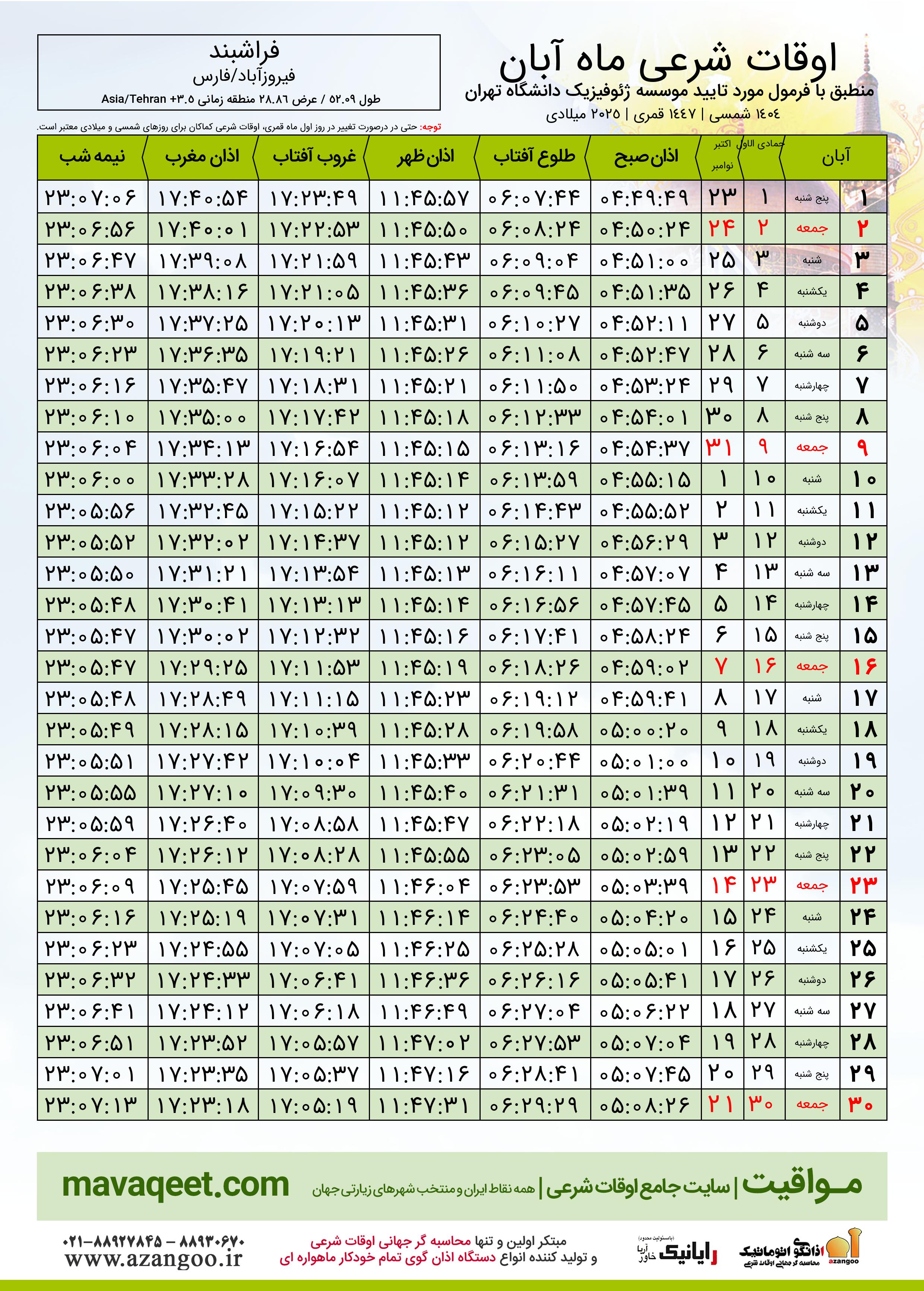 جدول اوقات شرعی آبان ١٤٠٤ شمسی شهر فراشبند