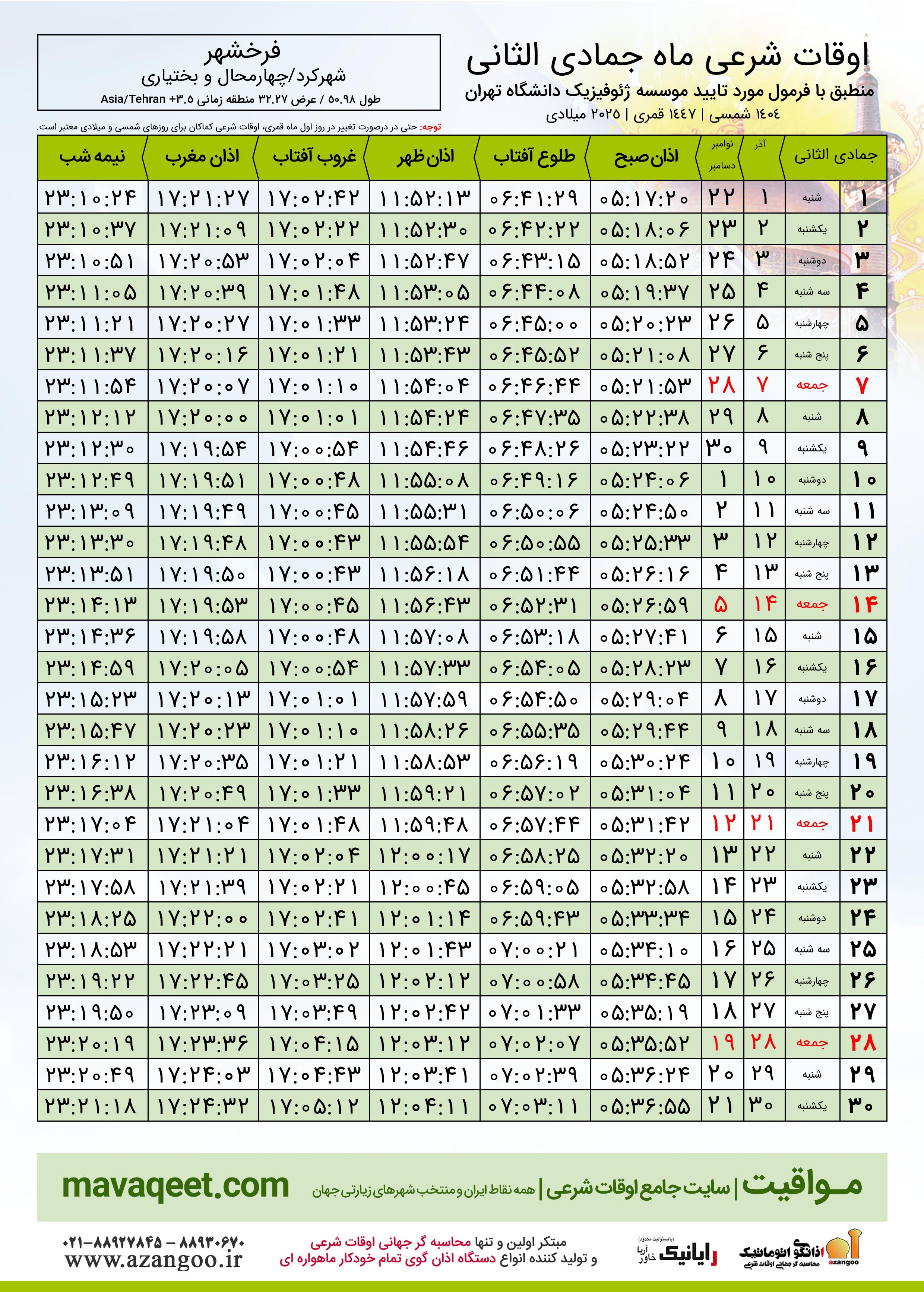 اوقات شرعی ماه جمادی الثانی ١٤٤٧ هـ.ق شهر فرخشهر بر