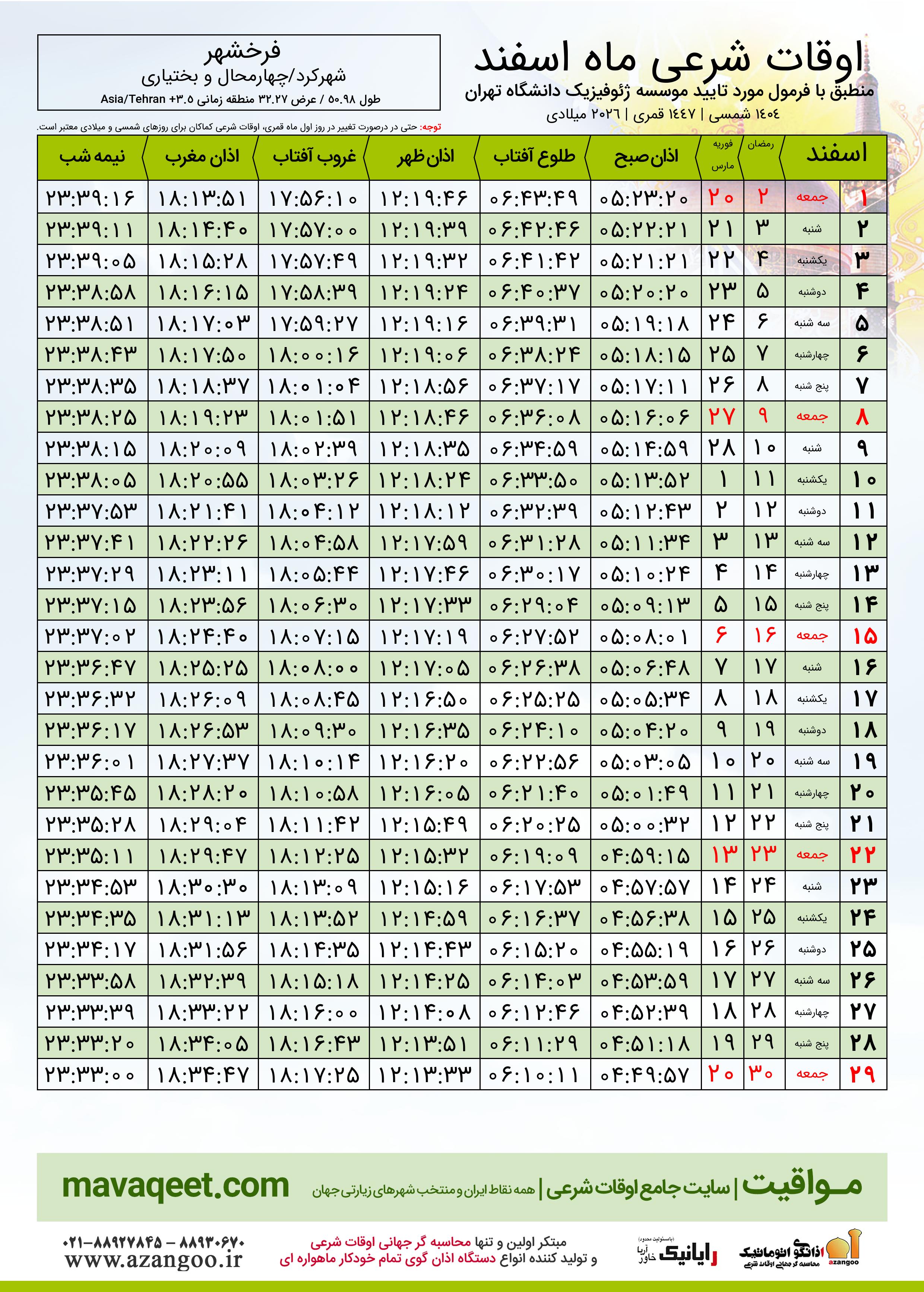 اوقات شرعی ماه رمضان شهر فرخشهر ١٤٠٤ - ٠٤ شمسی | ٢٠٢٦ میلادی