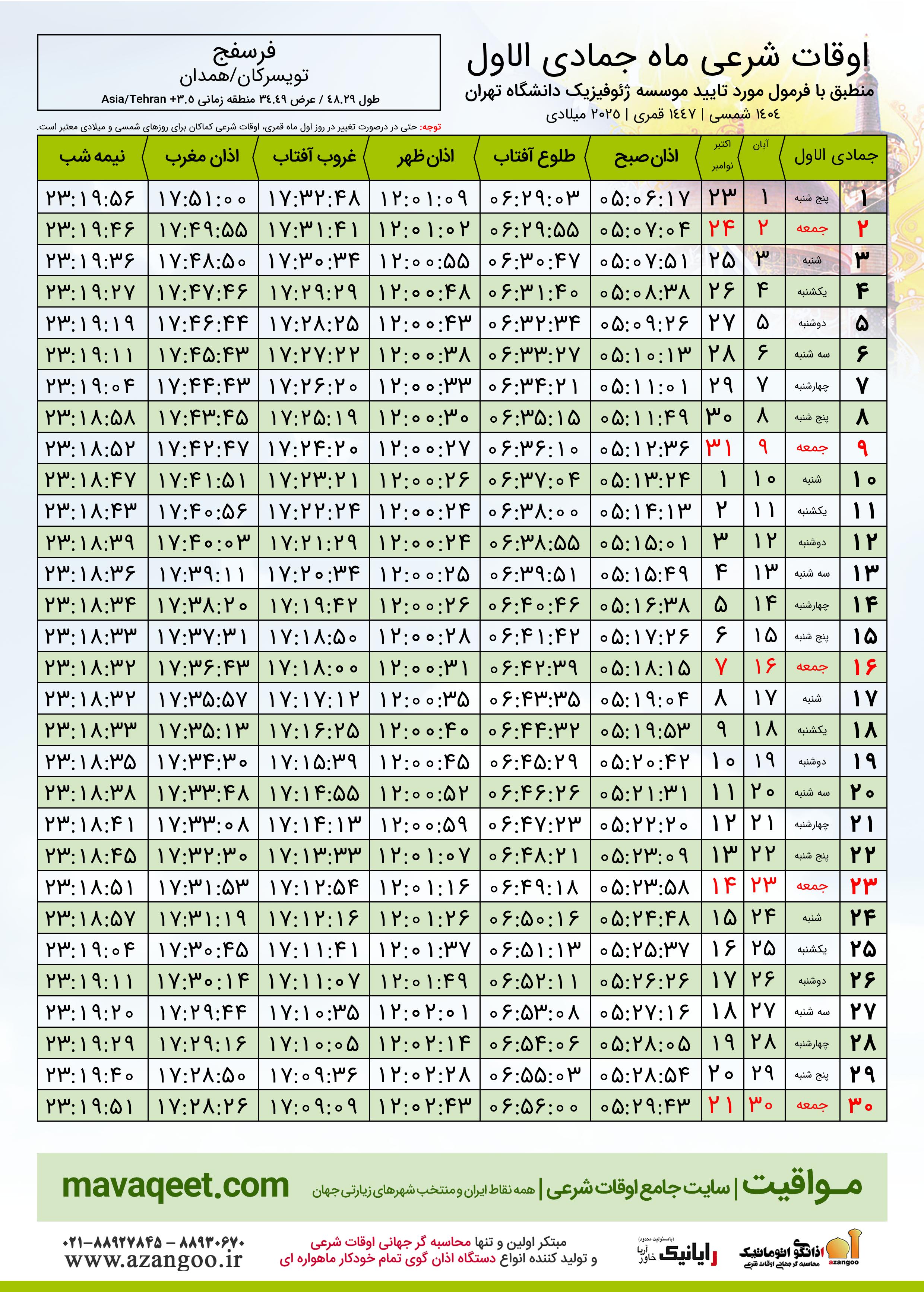 اوقات شرعی ماه جمادی الاول ١٤٤٧ هـ.ق شهر فرسفج بر
