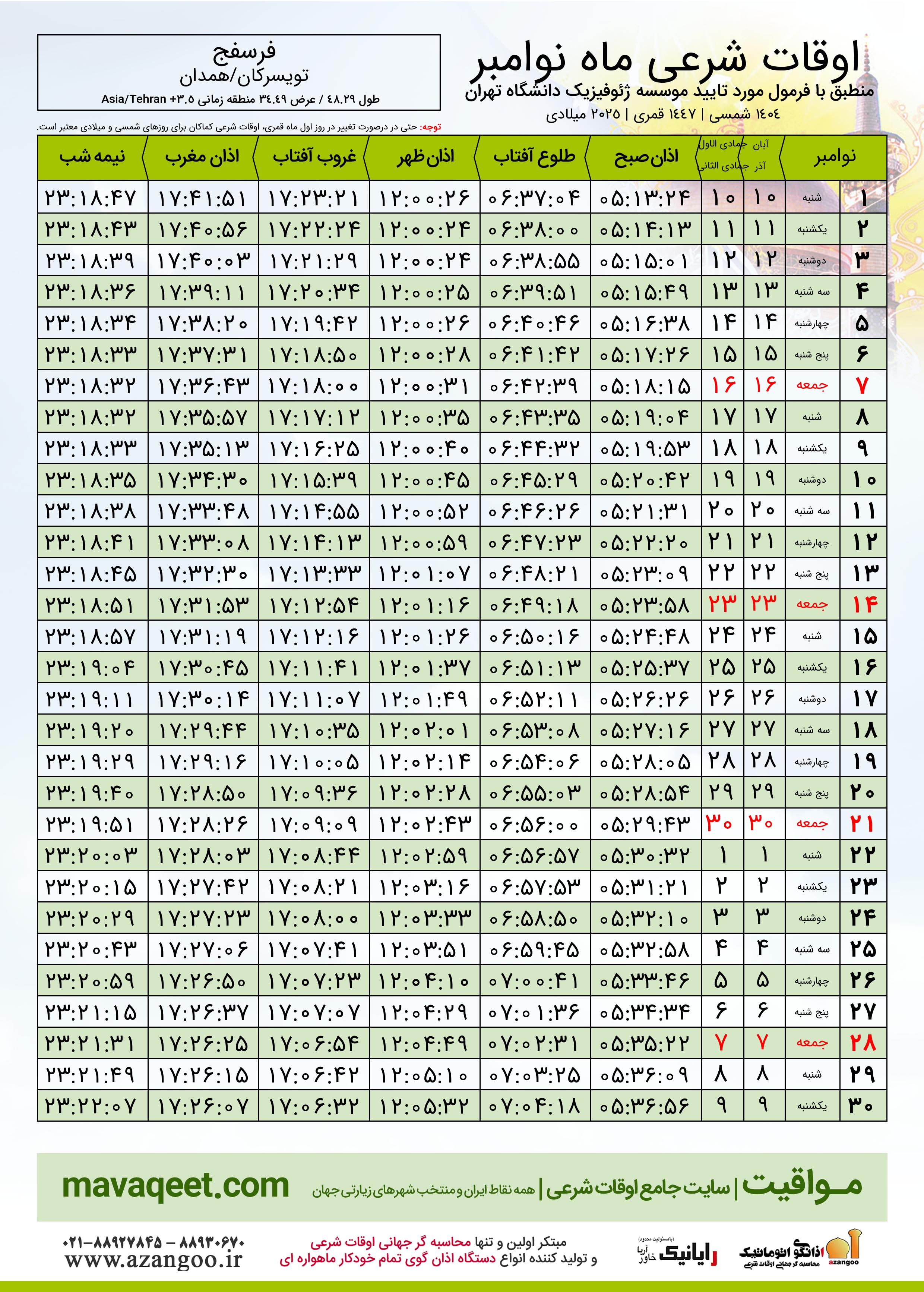 جهت نمایش تصویر جدول اوقات شرعی جدول اوقات شرعی نوامبر ٢٠٢٥ میلادی شهر فرسفج شهر فرسفج در اندازه