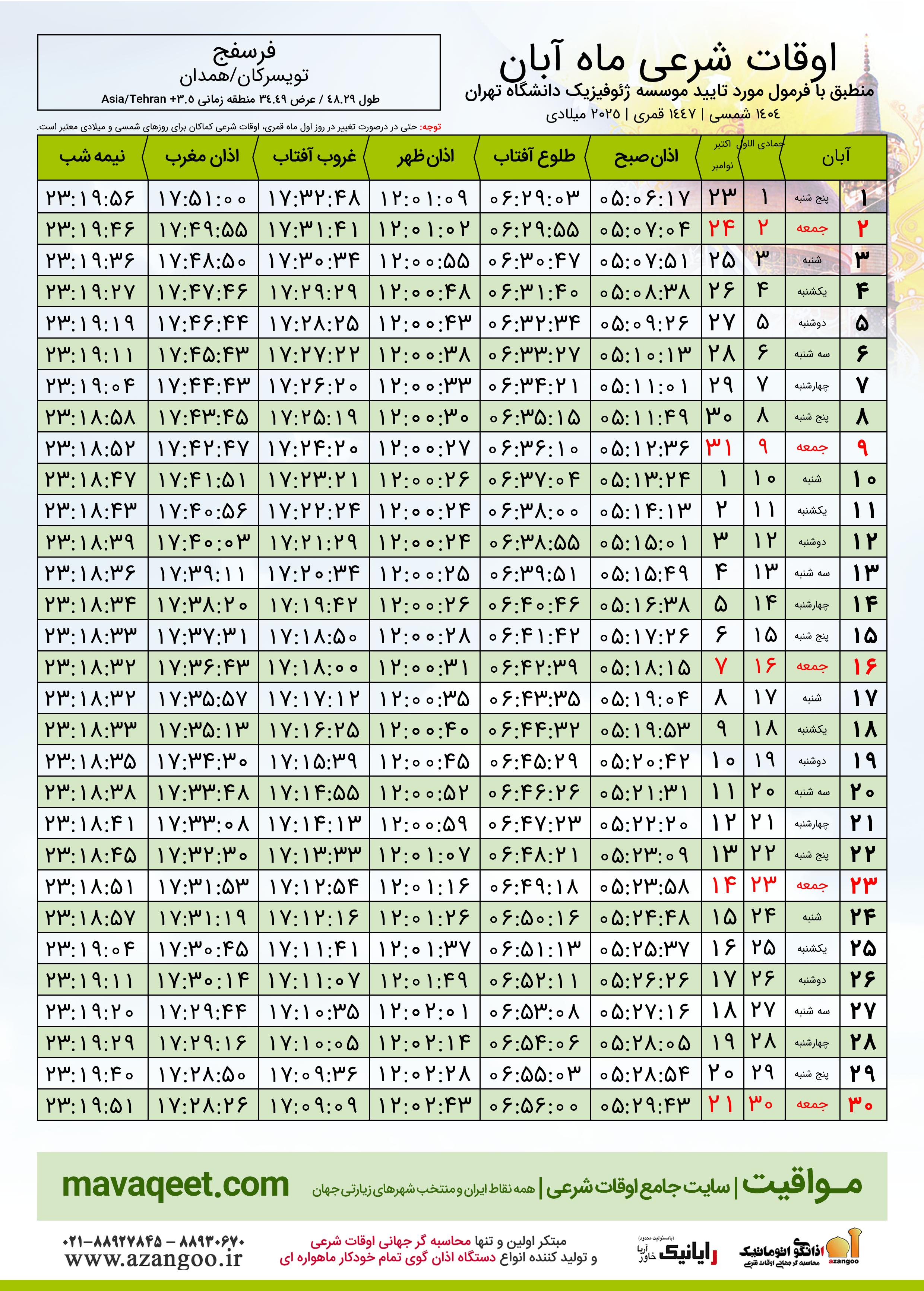 جدول اوقات شرعی آبان ١٤٠٤ شمسی شهر فرسفج