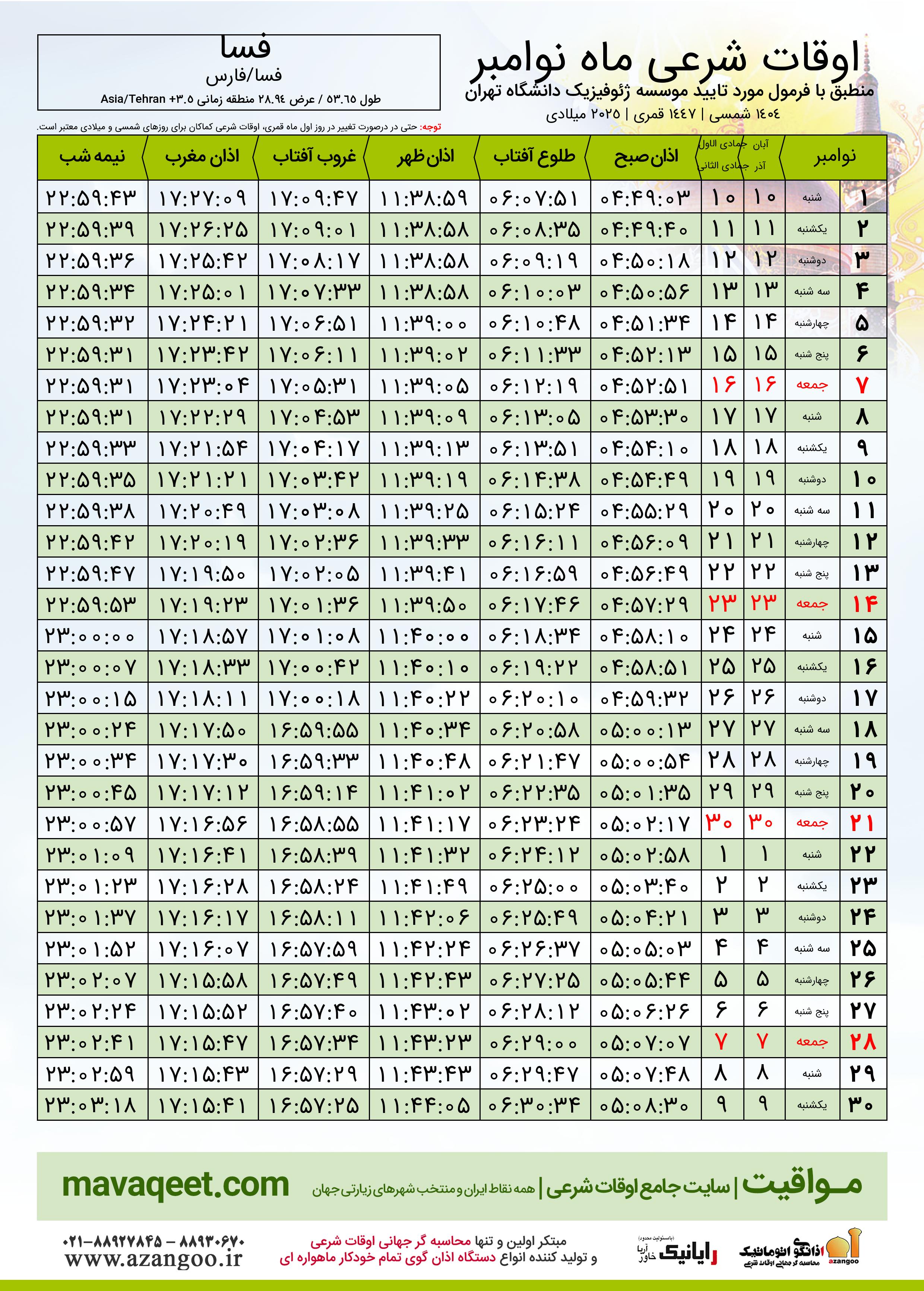 جهت نمایش تصویر جدول اوقات شرعی جدول اوقات شرعی آبان ١٤٠٤ شمسی شهر فسا شهر فسا در اندازه